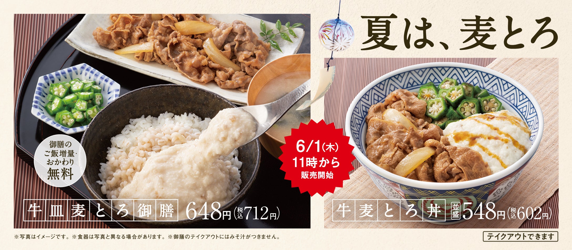 『牛皿麦とろ御膳』、『牛麦とろ丼』は、テイクアウトでも利用可能です。
