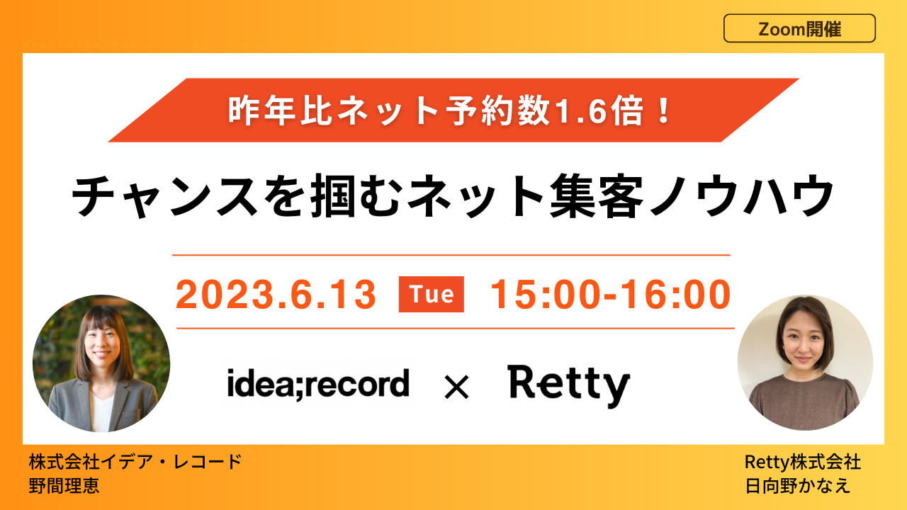 そこで本セミナーでは、予約管理サービス「GATE Reserve」を運営する株式会社イデア・レコードとグルメサイト「Retty」を運営するRetty株式会社が、飲食業界が盛り上がっている今行うべきネット集客対策や、ネット予約の効率的な管理法をご紹介します。