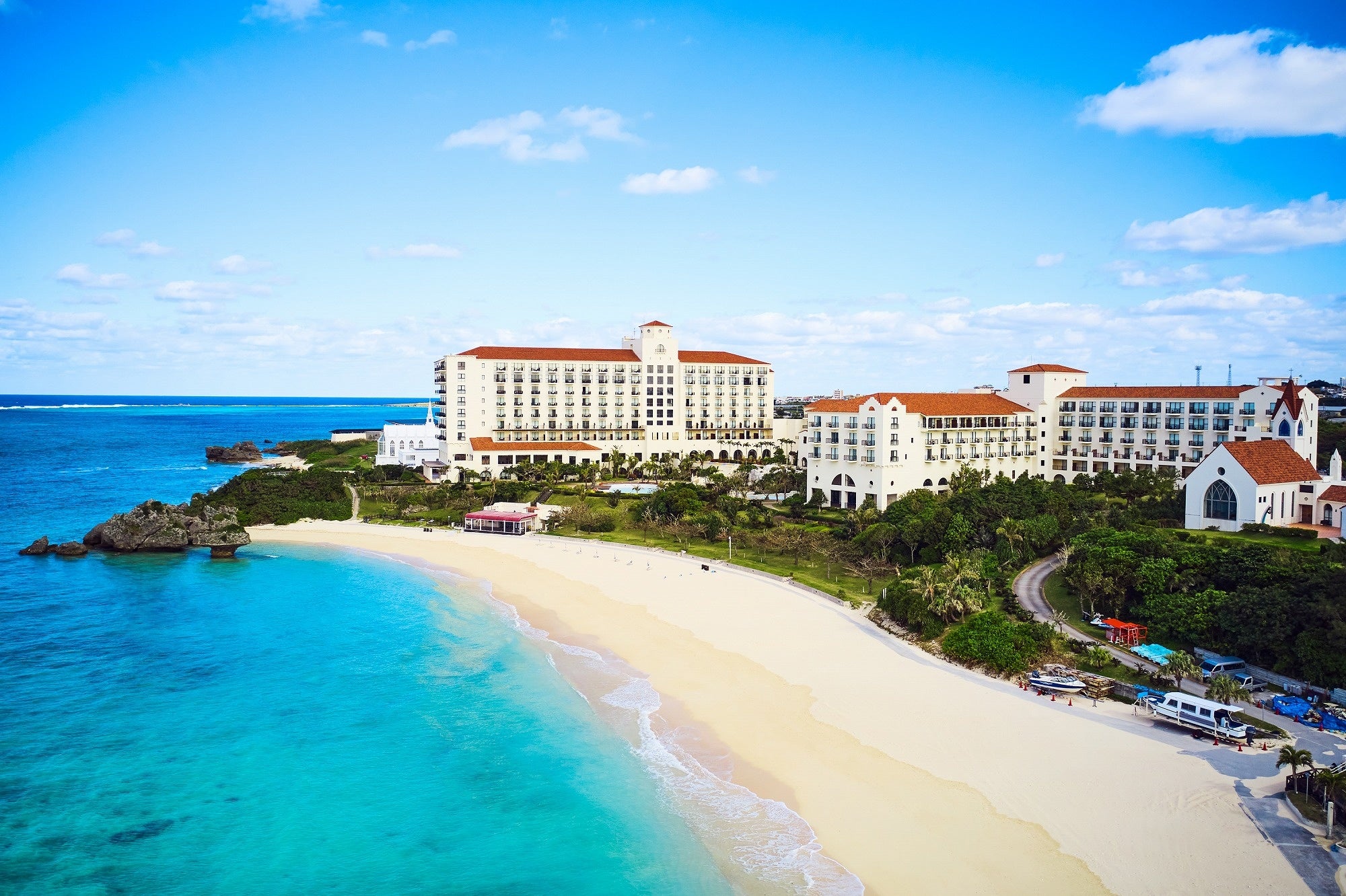 ホテル日航アリビラは、異国情緒漂うスパニッシュコロニアル調の建物が特徴的なオンザビーチのリゾートホテルです。ホテルの目の前は「アリビラブルー」と称される沖縄本島屈指の透明度を誇る海が広がります。