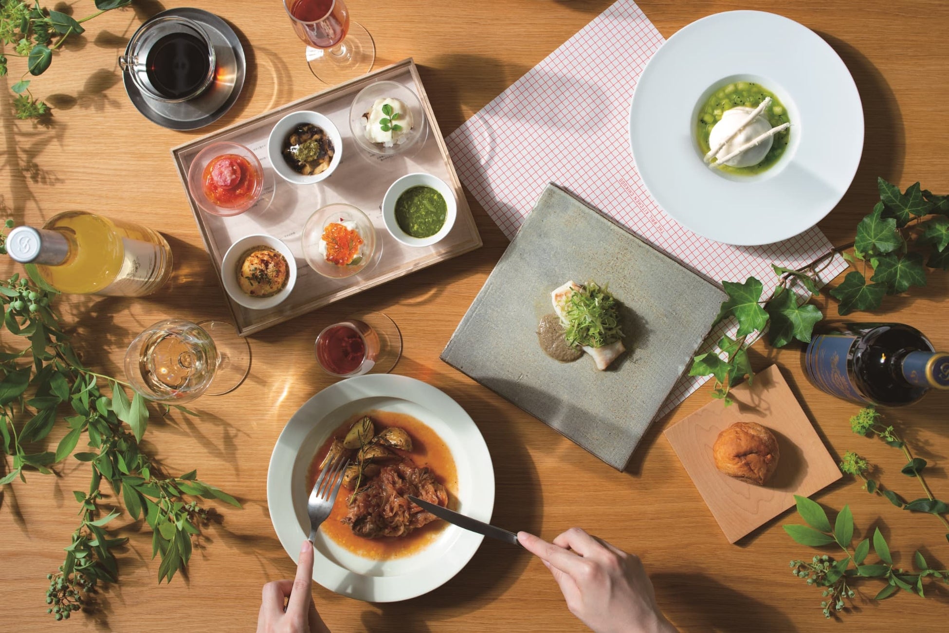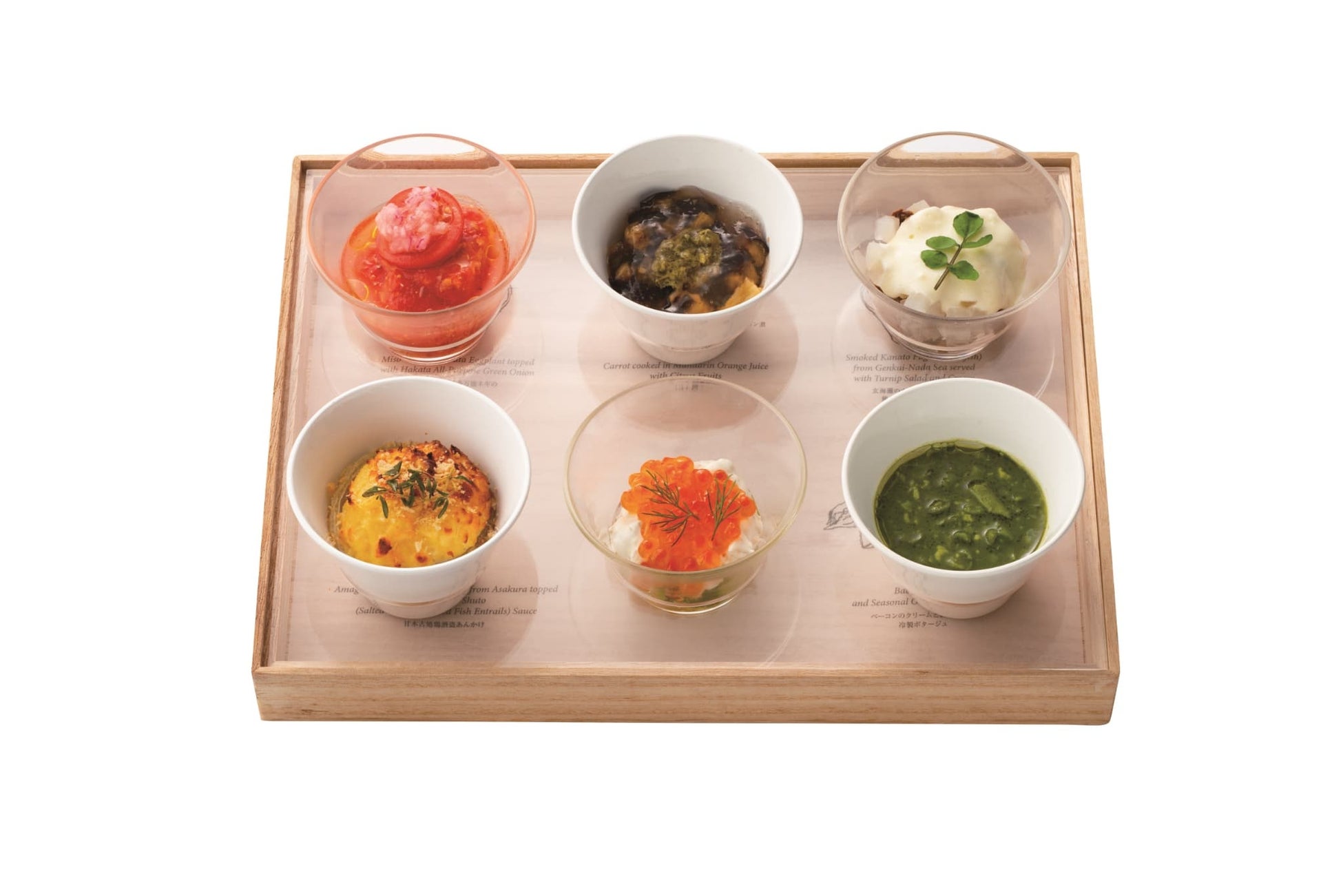 3人のシェフが2種ずつ監修した6種の前菜は、緑が目に鮮やかな「堀江銘茶園おくみどり抹茶といんげんの冷たい卵豆腐」や、トマトと里芋のテリーヌ、フレッシュトマトソース、プチトマトなど、三者三様の表情を楽しめる「トマトのサラダ」、糸島市でとれた旬のアジや福岡市産のなすをバルサミコとトマトでさっぱりとお楽しみいただける「鯵となす バルサミコのヴィネグレット トマトのジュレ」など、バラエティ豊かにお召し上がりいただけます。