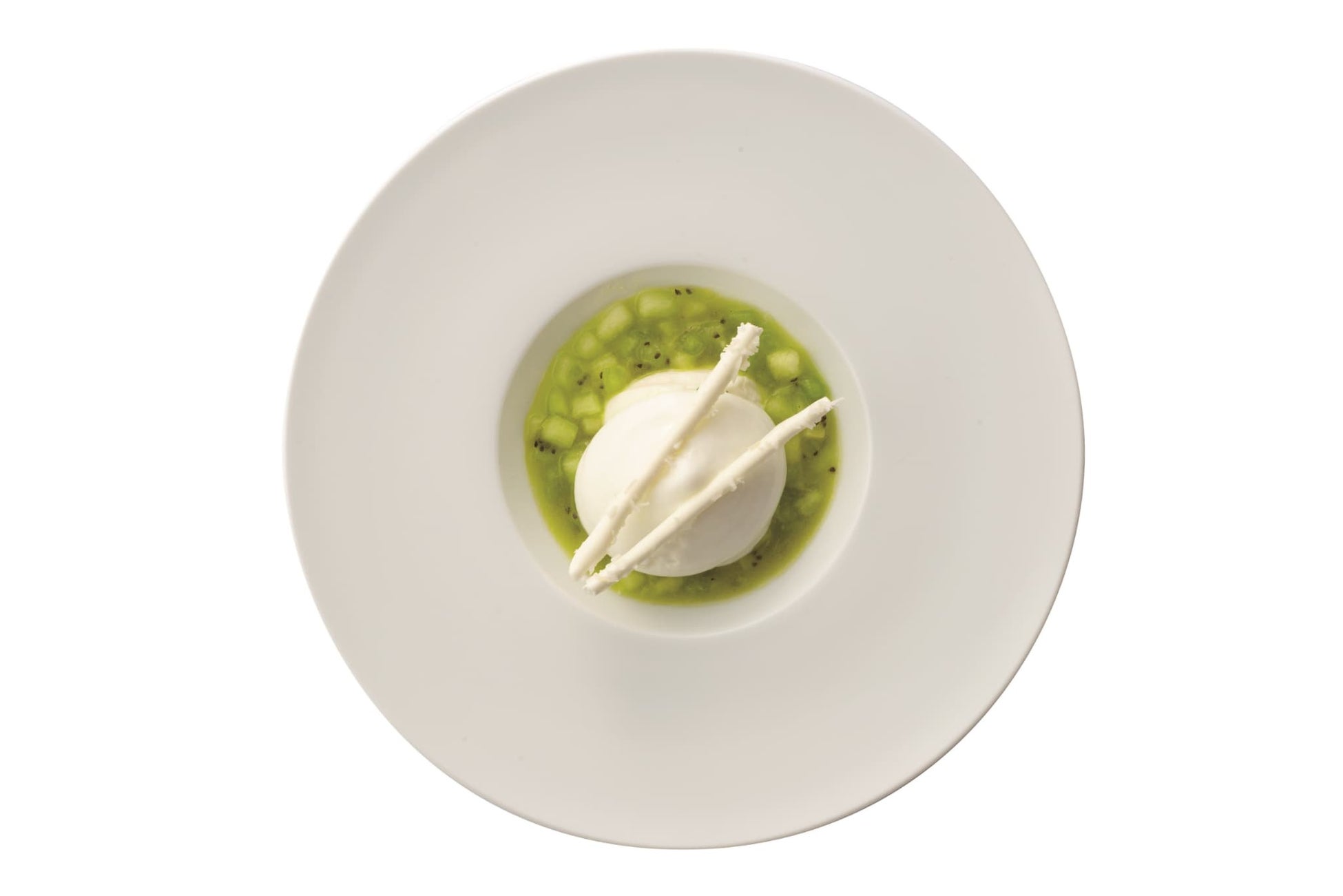 メロンとキウイのソースの上には、ココナッツのパンナコッタとバニラアイス、そして、ムースのように泡状となったバニラの「エスプーマ」が添えられ、酸味たっぷりのソースとマッチした締めくくりの一皿です。