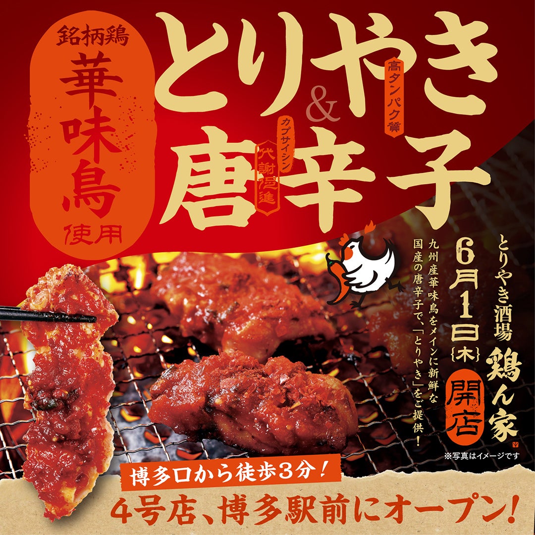 とりやき酒場 鶏ん家は「博多華味鳥」のグループ店で、福岡市内では4店舗目となります。今回4号店の博多駅前店は、JR博多駅 博多口より徒歩3分と、福岡市以外の近隣地域からもご来店いただきやすい場所に店舗を構え、2号店の博多駅筑紫口店と同じく「美味しく・ヘルシーなとりやき」をコンセプトにしております。自社ブランド鶏 ”華味⿃” の鶏肉をメインとし、リーズナブルな価格でご提供。さらに希少な国産唐辛子を使用したメニューなどを取り揃え、高タンパク質・低カロリーの鶏肉とカプサイシンで代謝を上げ、まるで家にいるかのようなリラックスした気分でお腹も心も満たしていただけるお店となっております。また、当店では美味しい状態でお召し上がりいただけるよう、”焼き”までサポートしております。焼き加減はスタッフにお任せください!