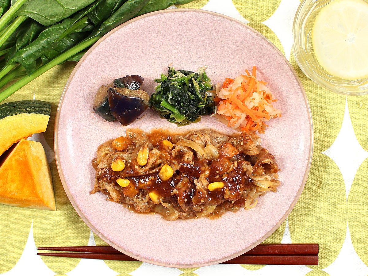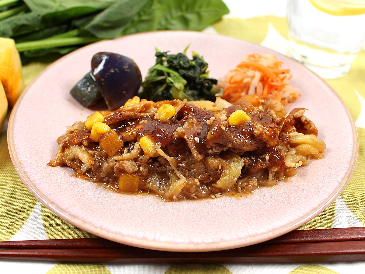 にんにくスタミナメニューの登場です。牛バラ肉に本醸造醤油のもみだれをからめて、コクと風味のある特製焼肉のたれをかけました。キャベツ、もやし、かぼちゃ、コーンと共にお召し上がりください。