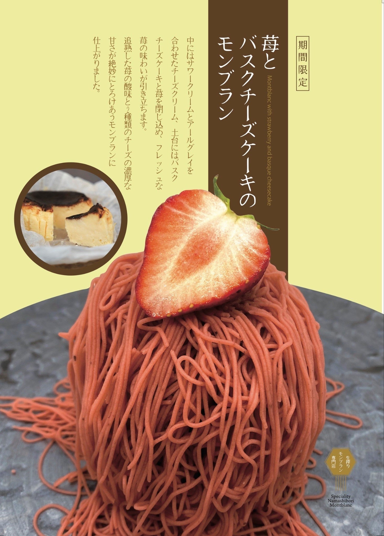 この時季だけ味わえる風味豊かなフレッシュないちごと、酸味が魅力の追熟したいちごピュレを混ぜ込んだ特製モンブランクリーム、そして2種のチーズの濃厚な甘さが絶妙にとろけあい、極上のカルテットを奏でる「苺とバスクチーズケーキのモンブラン」。
