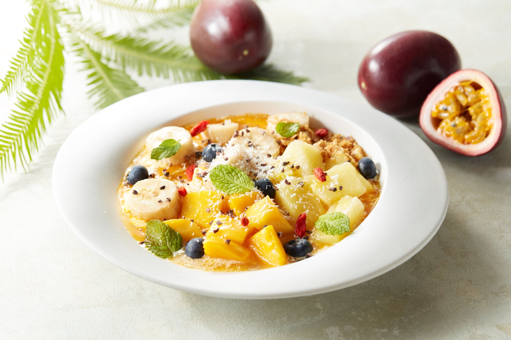 大人気のフルーツボウルからリリコイバージョンが夏季限定登場。有機豆乳と有機甘酒で作った自家製のヴィーガンソフトクリームをベースに、甘酸っぱいリリコイのピュレに、マンゴーやパイナップル、ブルーベリー、バナナなどのフルーツを添え、ザクザク食感の大麦グラノーラや様々なスーパーフードをトッピングした、ひんやり冷たいフルーツボウルです。