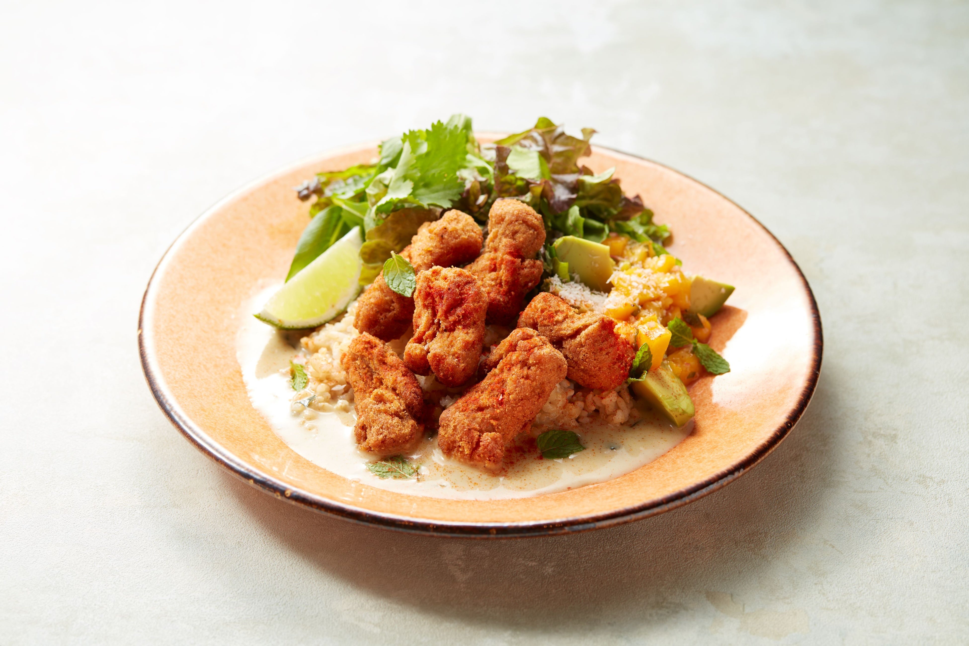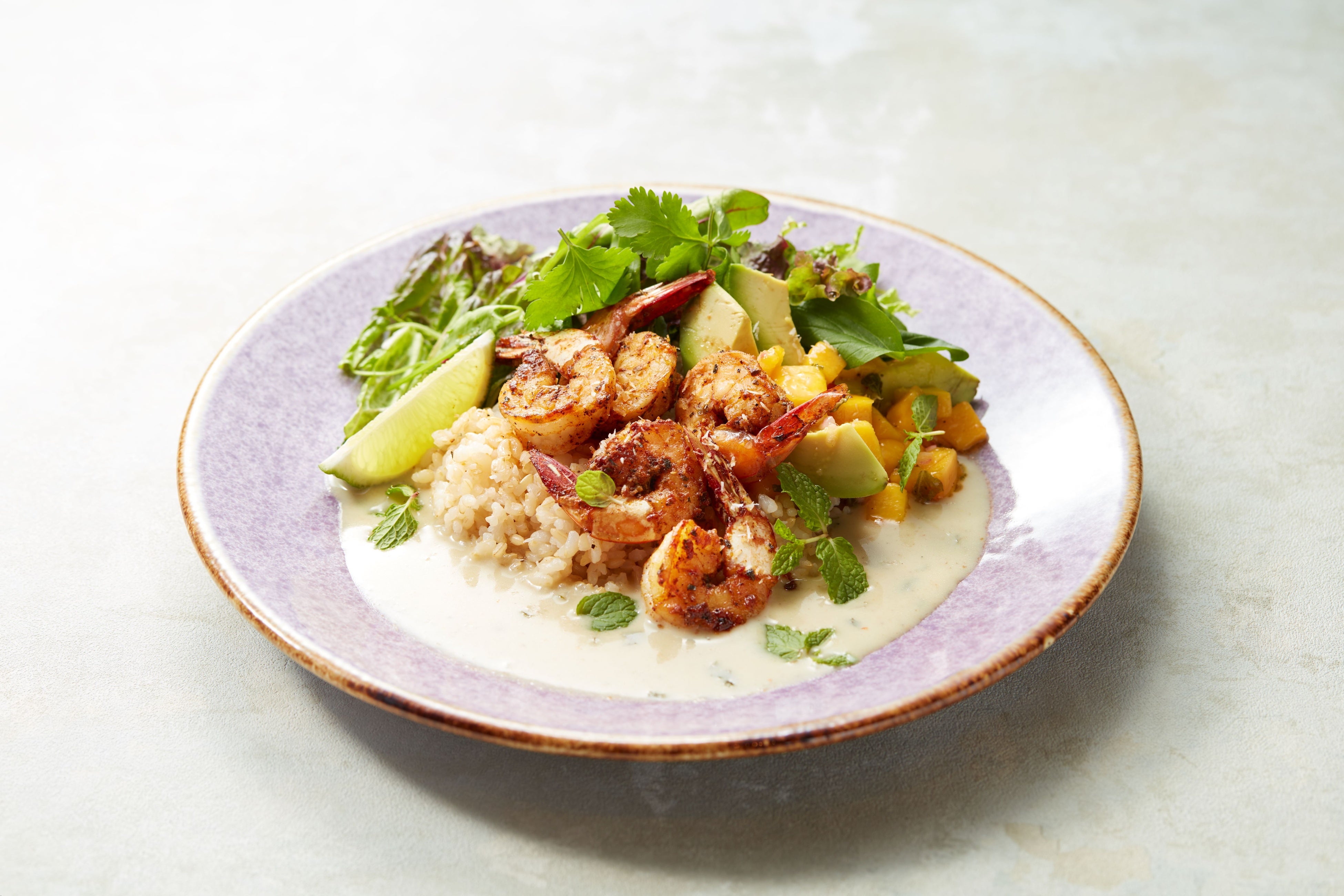 アメリカ南部のケイジャンスパイスを使用したピリッとほどよい刺激がクセになるガーリックシュリンプに、アボカドとマンゴーサルサ、ミントを合わせ、クミンやターメリックを効かせたココナッツクリームソースをたっぷりと。これからの季節にピッタリの食欲そそるカリフォルニア風エスニックライスボウルです。香ばしく仕上げたえびの尾まで、美味しくお召し上がりいただけます。