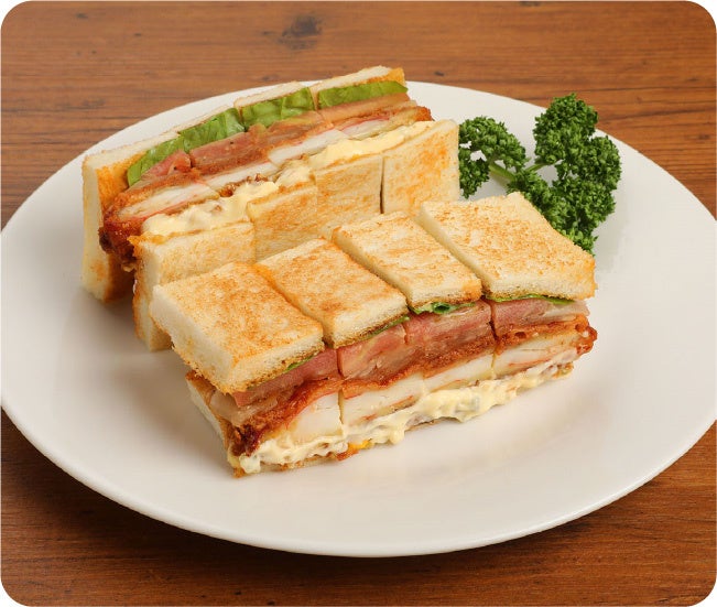 昭和28年創業、大阪・難波のサンドイッチパーラーの味を受け継ぐお店から。2尾のエビと、トマトや玉ねぎ、サラダ菜を自家製のタルタルソース&カクテルソースとともにサンド。お店で愛される、ボリューミーな鉄板メニュー。
