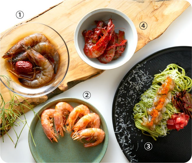 ③幸えびの韓国風冷製ジェノベーゼパスタ(1人前)1,500円 ④幸えびのキムチ(1人前)600円