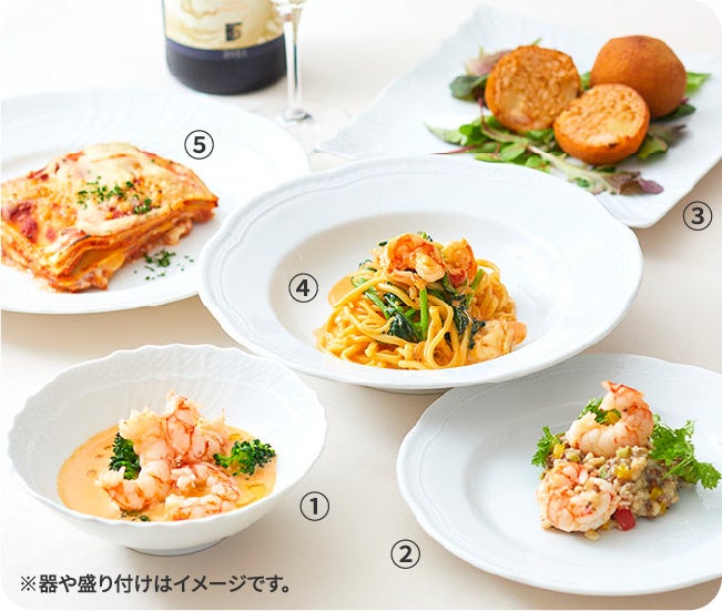 ④トンナレッリ 海老のトマトクリームソース(1人前)1,430円 ⑤海老のラザーニャ(1人前)1,430円