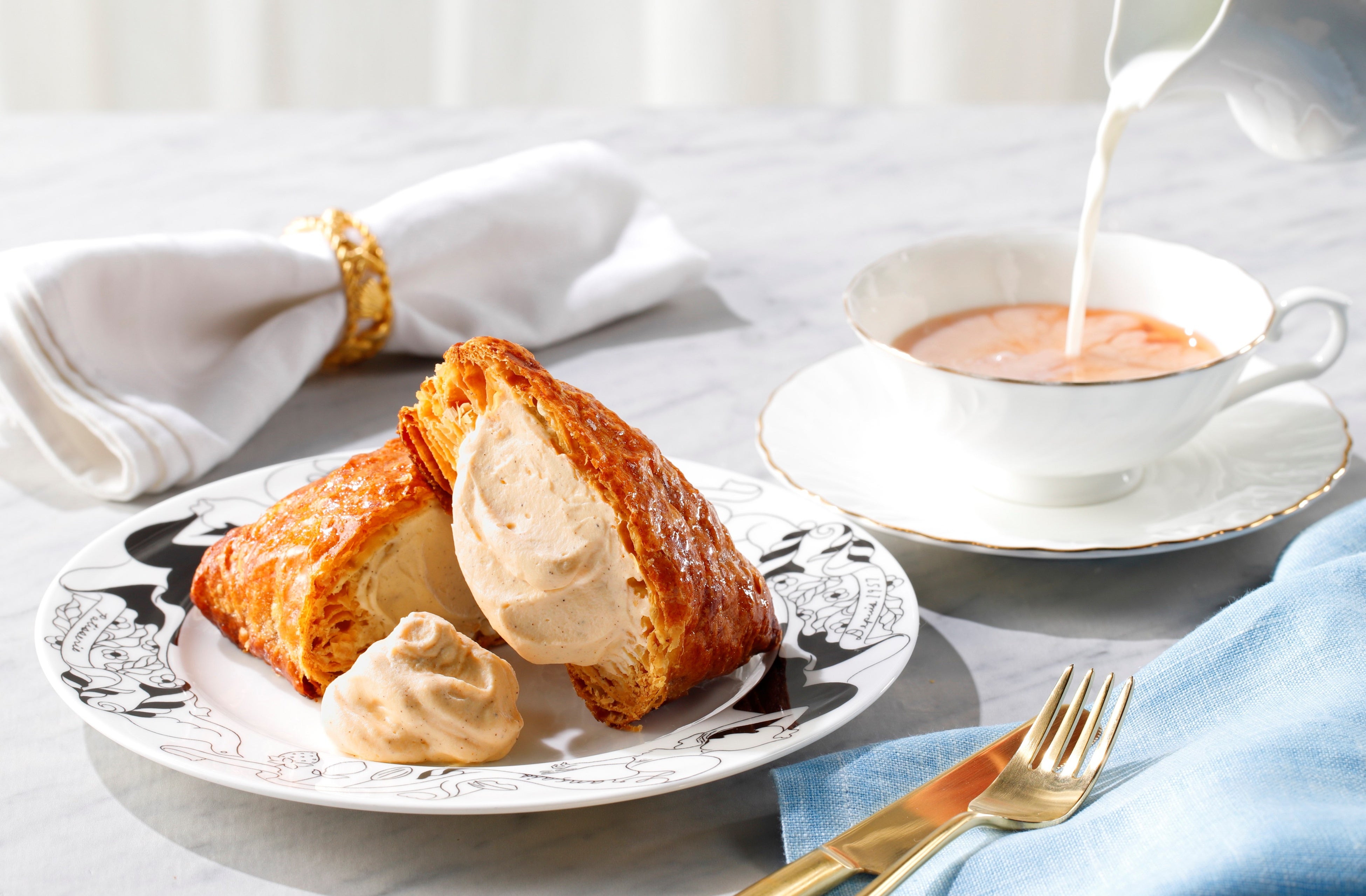 ロイヤルミルクティー味のクリームは、北海道産のオリジナル生クリームに、マスカルポーネとカスタードをブレンドしており、紅茶との調和が奏でる深いコクとやさしい香りが広がります。