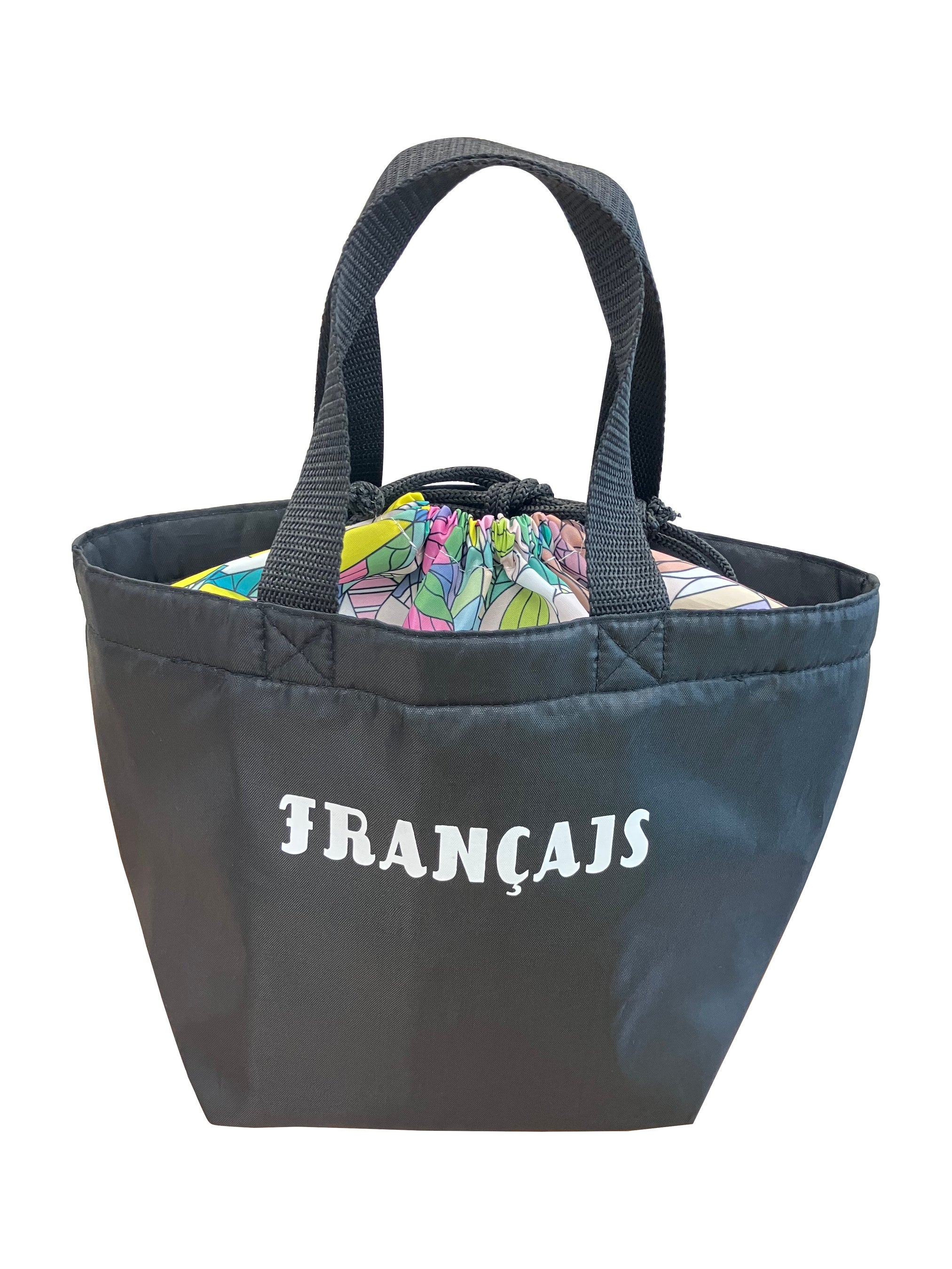 ブラックの色が美しく映えるサテン生地で仕上げた上品でシンプルな作りに加え、巾着部分にはフランセ表参道本店のステンドグラスのデザインをカラフルに表現したとても素敵な保冷バッグです!ちょっとしたお買い物や、ランチバッグとしてもおすすめです!