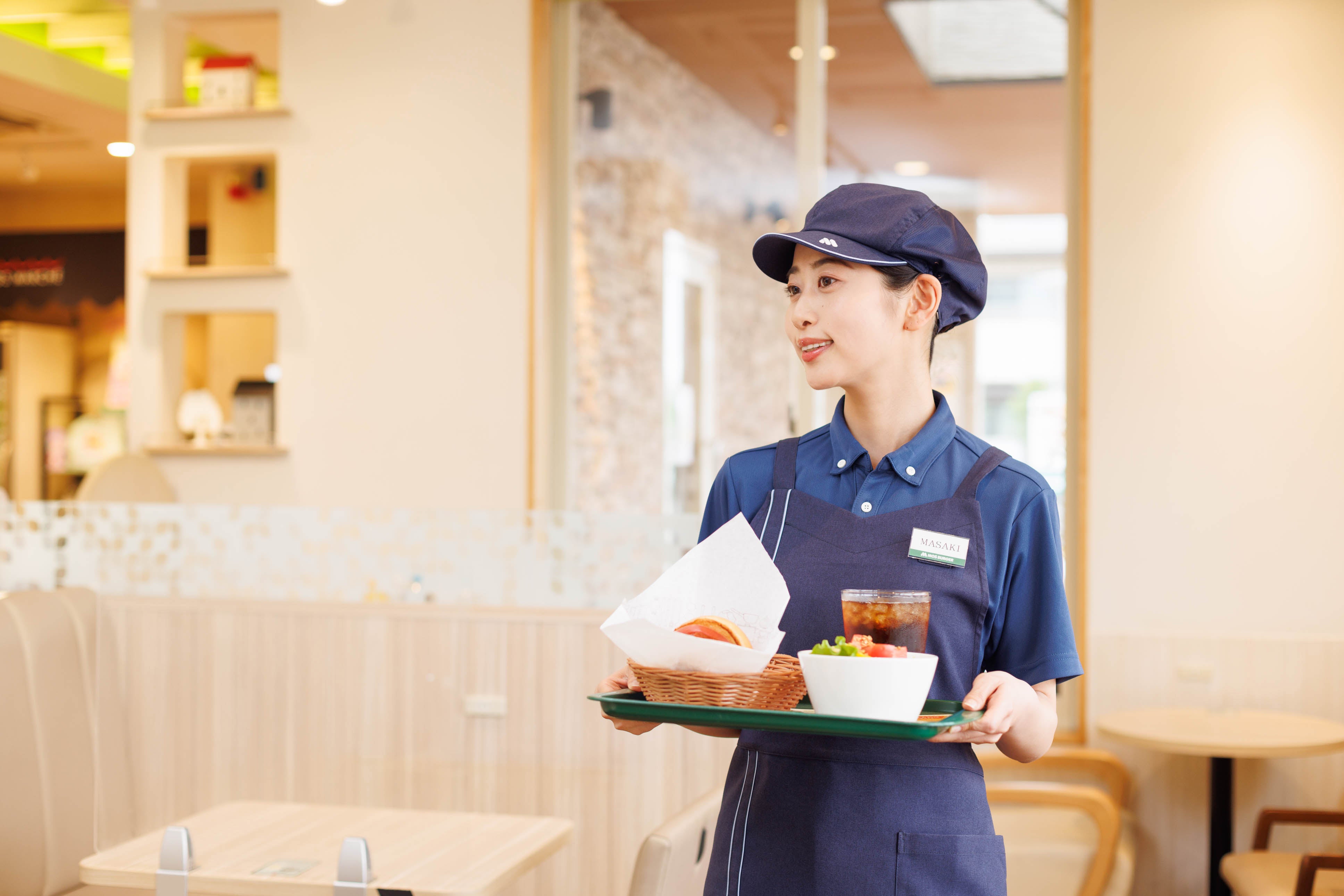 新しいコスチュームは、「快適さ」をテーマに、機能性と着心地の良さを重視しました。デザインを手がけたのは、ファッションデザイナー安藤大春氏(https://ohalando.com)です。今回は、新しい設計のモス店舗にも合うよう、ブルーを基調とした「品格」「清潔感」が感じられるデザインにしました。働き手の視点に立った機能的な設計に加え、スタイリッシュな見た目にすることで「着てみたい、モスで働いてみたい」と思ってもらえるコスチュームを目指しました。