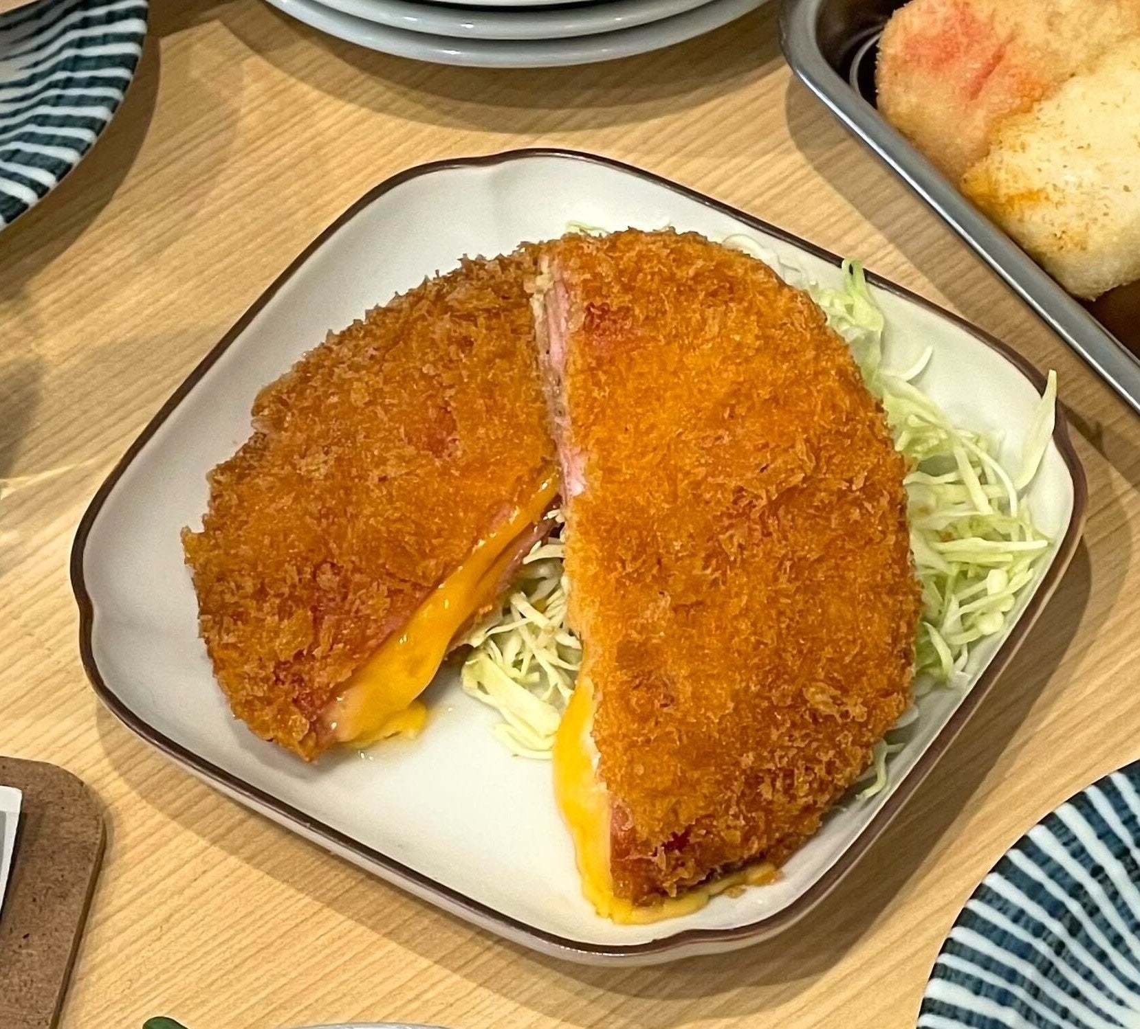 スライスハムに熱々とろとろの濃厚なチェダーチーズを挟んだ ハムカツです。