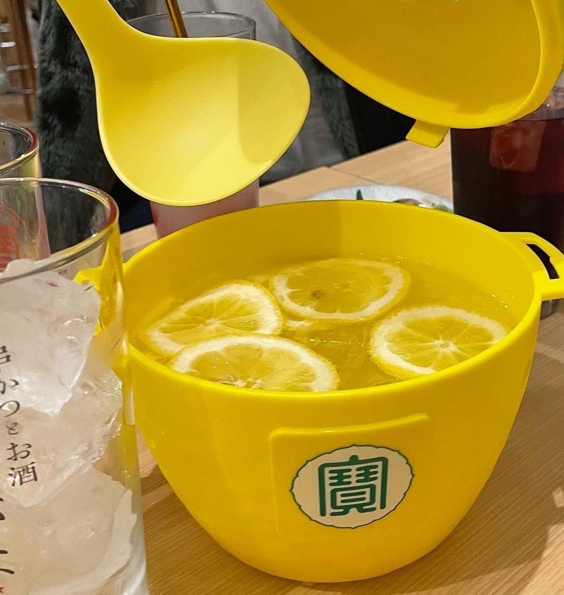レモン型のかわいい容器には4杯分のレモンサワー! 専用の黄色いおたまでグラスに注ぐのも楽しいですよ。