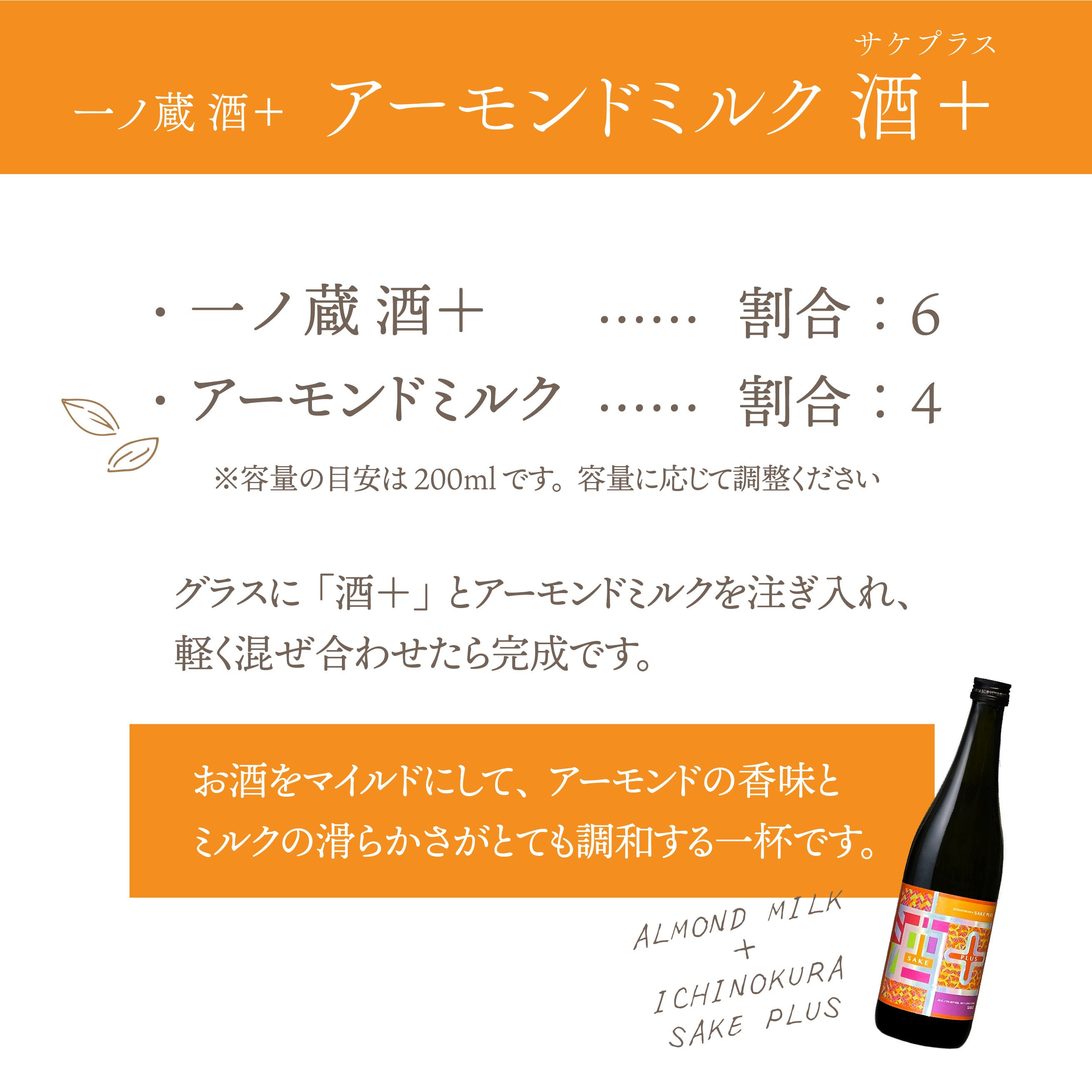 グラスに「酒+」とアーモンドミルクを注ぎ入れ、軽く混ぜ合わせたら完成!