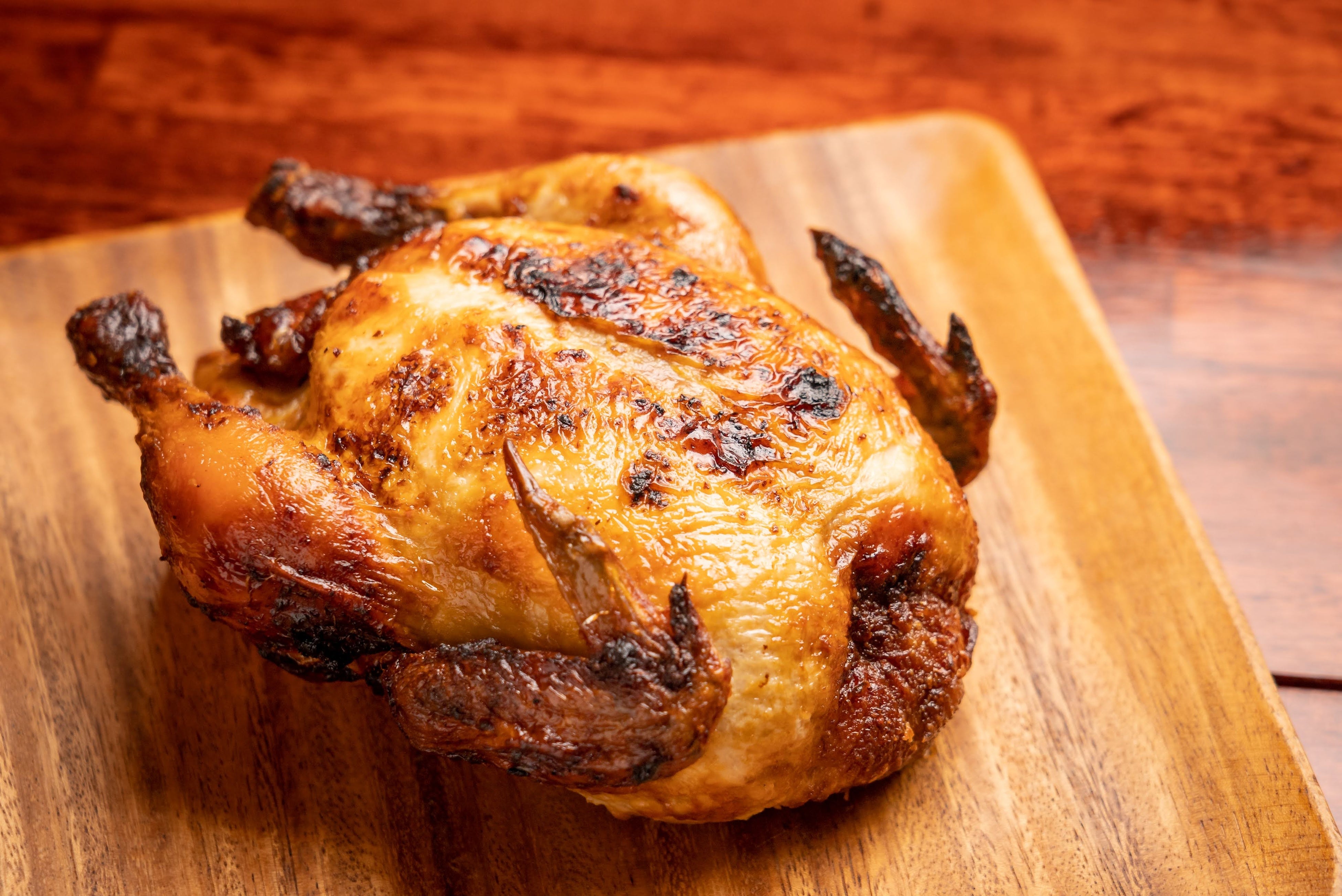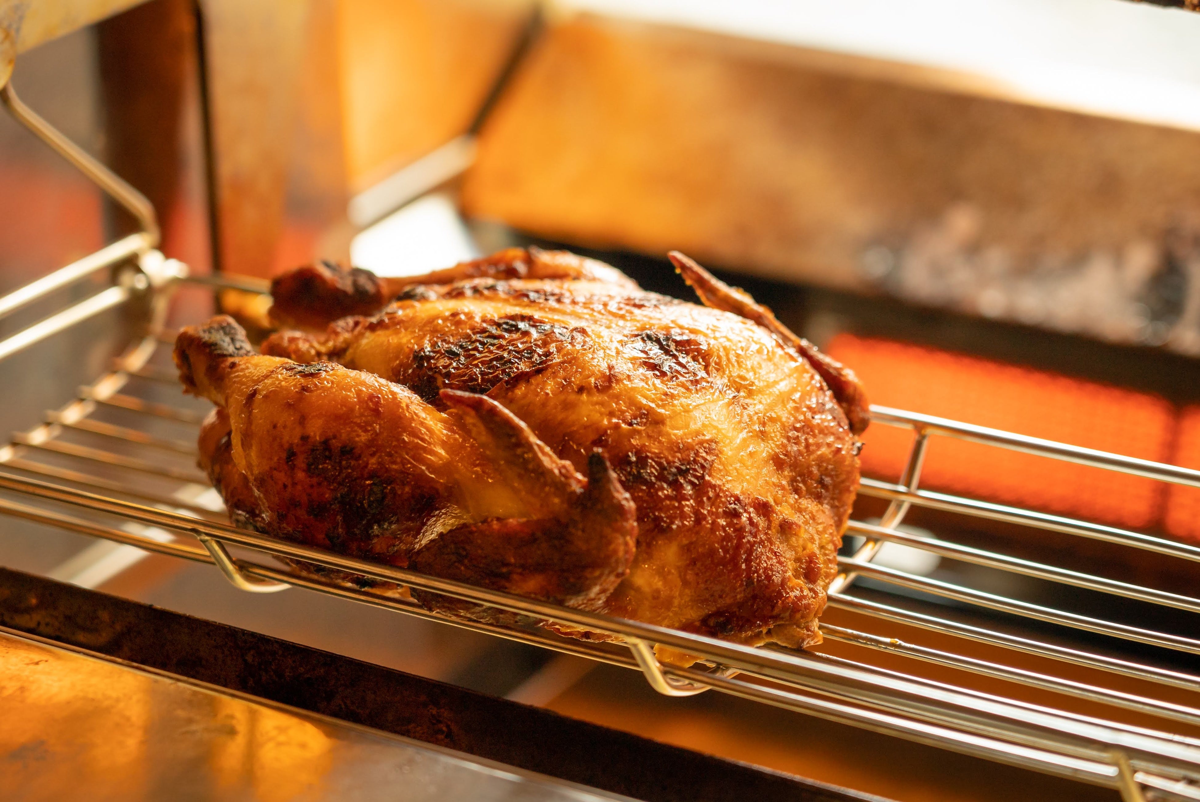 丸鶏にニンニクとハーブをベースとした詰め物を詰めて、特製のマリネ液でまるまる2日間かけてじっくり漬け込みます。マリネした丸鶏を専用のロティサリーオーブンで2時間かけてゆっくり焼き上げることで、ニンニクとハーブの香りが広がり胸肉もしっとりした食感で仕上げることが可能となりました。