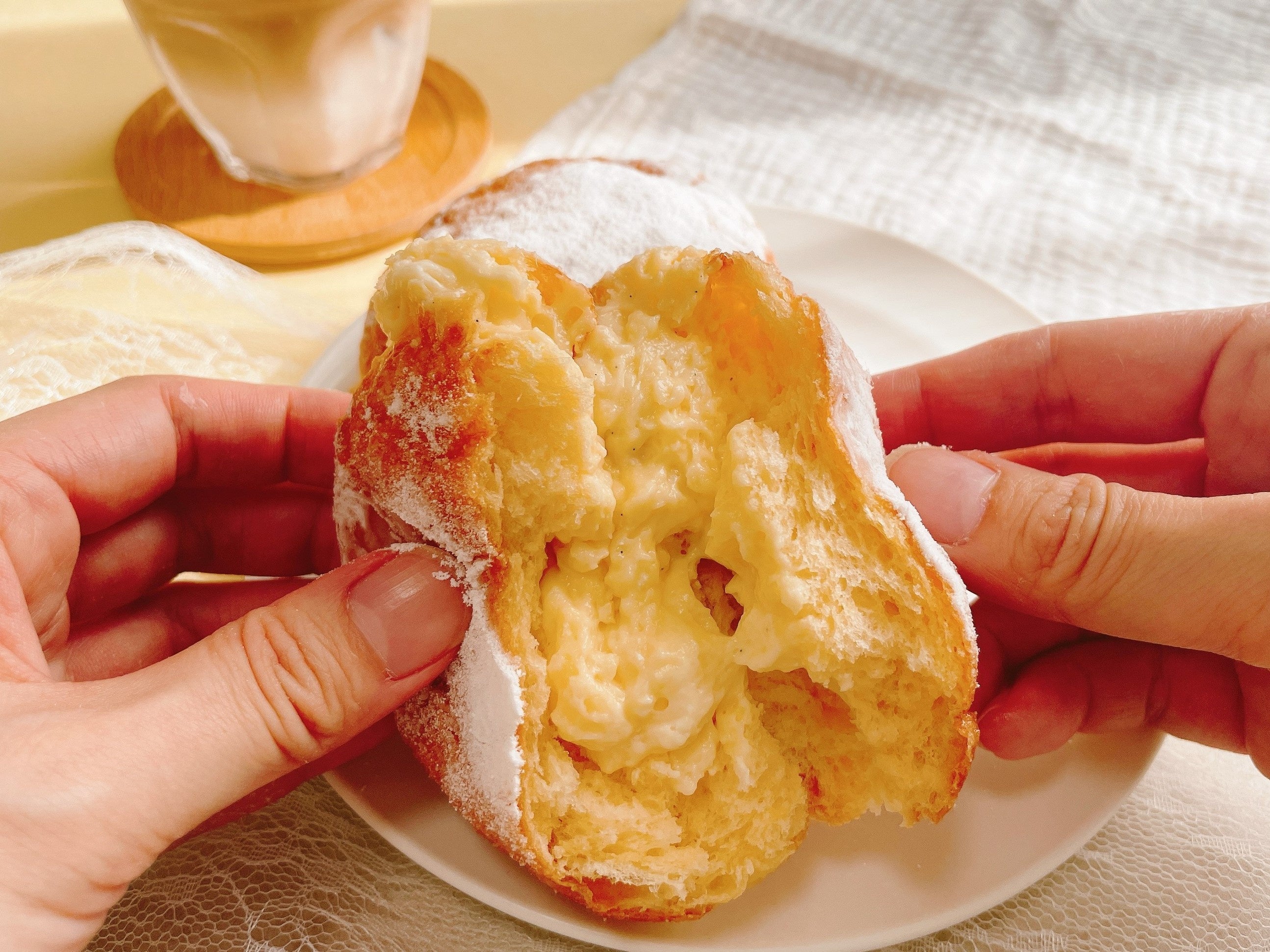 生の生地のようにやわらかなくちどけのふわっふわ生地に、とろっとなめらかなカスタードホイップをたっぷりと詰めたクリームドーナツ。