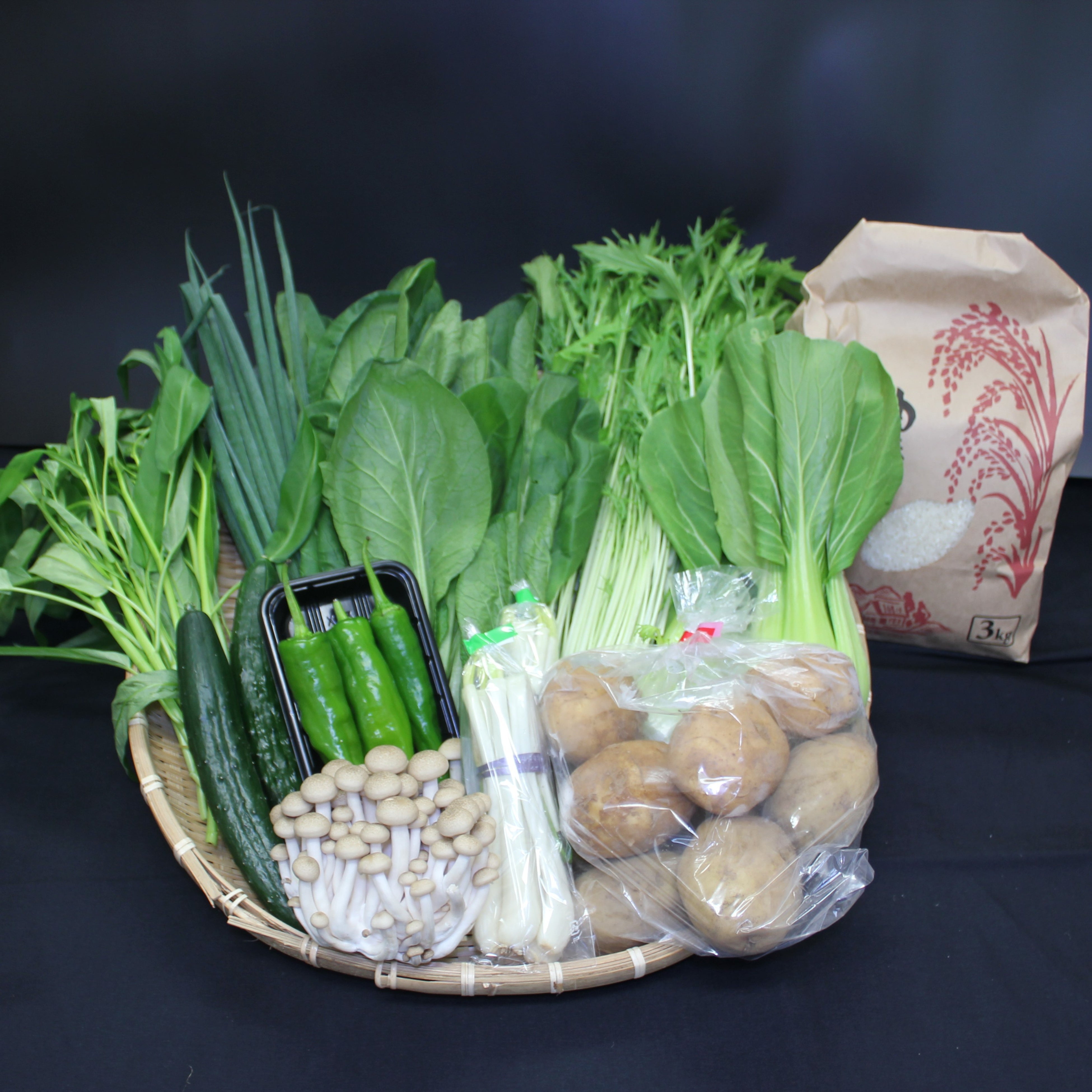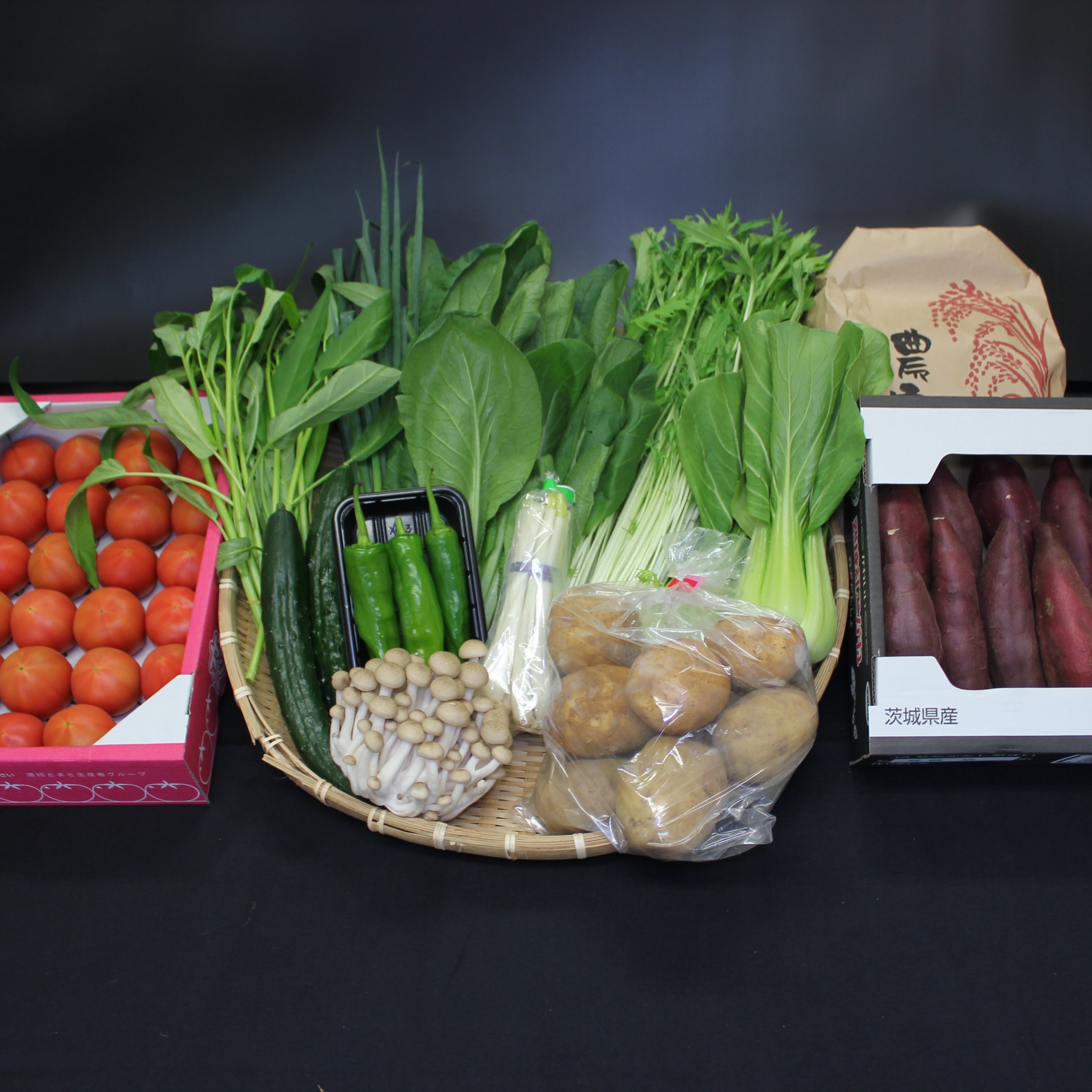 ・行方産の野菜12品目(じゃがいも、四葉きゅうり、ぶなしめじ、エシャレット、小ねぎ、チンゲン菜、みず菜、ジャンボししとう、あさがお菜、小松菜、恋のつぼみAM2㎏、熟成紅こがねAM1kg)