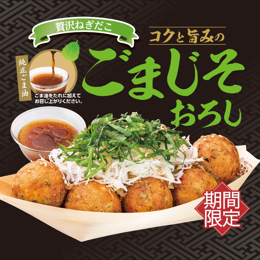 “贅沢ねぎだこシリーズ” コクと旨みの 『ごまじそおろし』 は、「この時期にさっぱり食べやすい!」 と大好評の期間限定商品です。アッツアツのたこ焼に、“シャキシャキの白ねぎ” と、和のハーブとも呼ばれている “フレッシュで香り豊かな大葉” をたっぷり乗せ、別添えの国産大葉100%使用の 「青じそポン酢(小袋)」 と 「大根おろし(小袋)」を専用カップに入れ、さらに!ふわっと広がる濃厚な 「純正ごま油(小袋)」 を加え、たこ焼・ねぎ・大葉をたっぷり絡めてお召し上がりいただく逸品です!