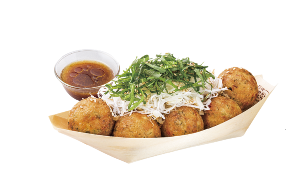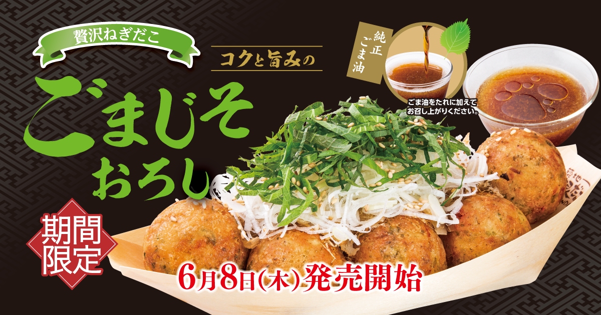 “贅沢ねぎだこシリーズ” コクと旨みの 『ごまじそおろし』 は、「この時期にさっぱり食べやすい!」 と大好評の期間限定商品です。アッツアツのたこ焼に、“シャキシャキの白ねぎ” と、和のハーブとも呼ばれている “フレッシュで香り豊かな大葉” をたっぷり乗せ、別添えの国産大葉100%使用の 「青じそポン酢(小袋)」 と 「大根おろし(小袋)」を専用カップに入れ、さらに!ふわっと広がる濃厚な 「純正ごま油(小袋)」 を加え、たこ焼・ねぎ・大葉をたっぷり絡めてお召し上がりいただく逸品です!