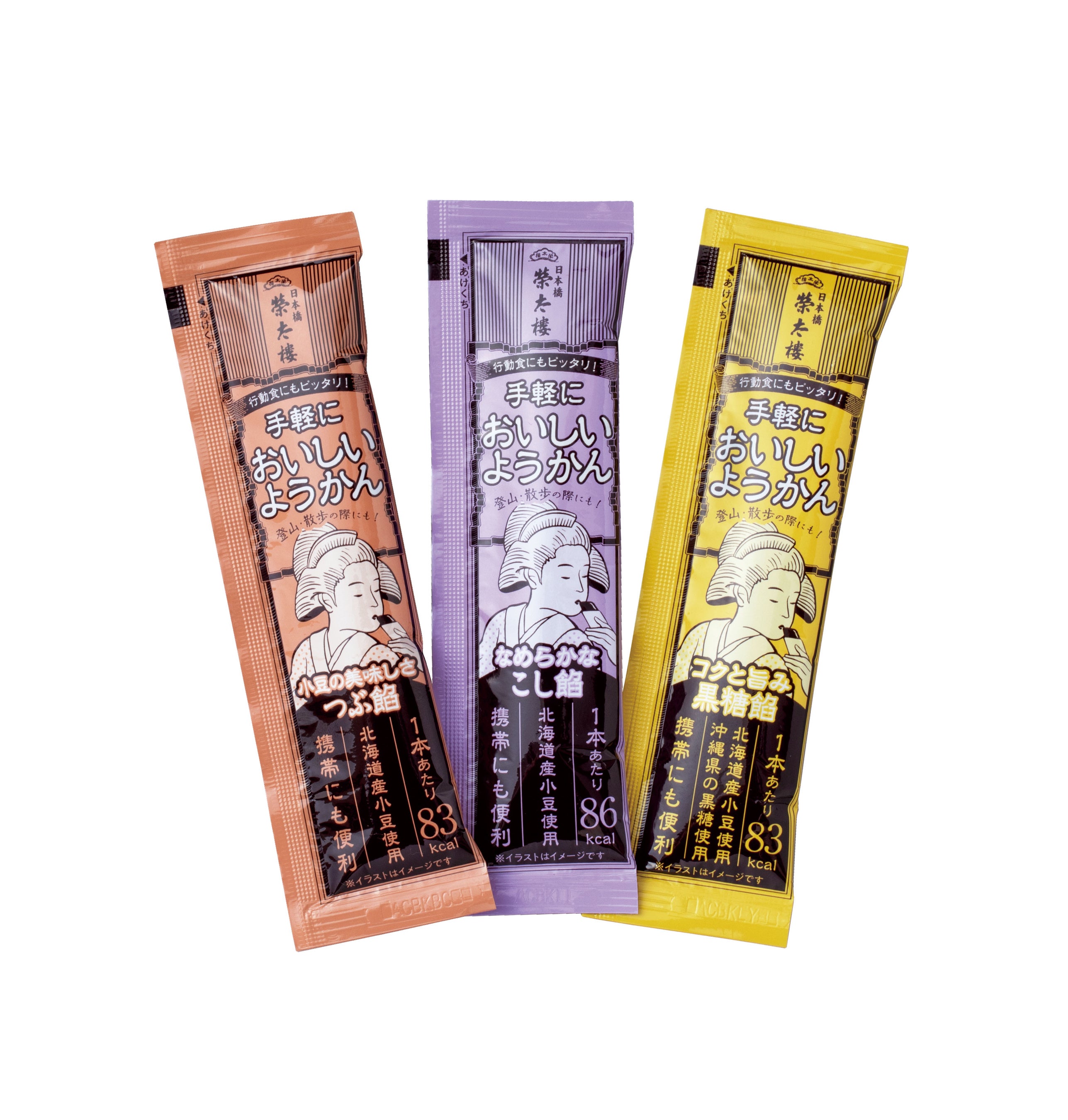 素材の味を大切にした食べやすいスティックタイプでどこでも本格的な味が楽しめ、北海道産小豆を使用した、こし餡、つぶ餡、黒糖餡と3種類の味が一袋で味わえます。