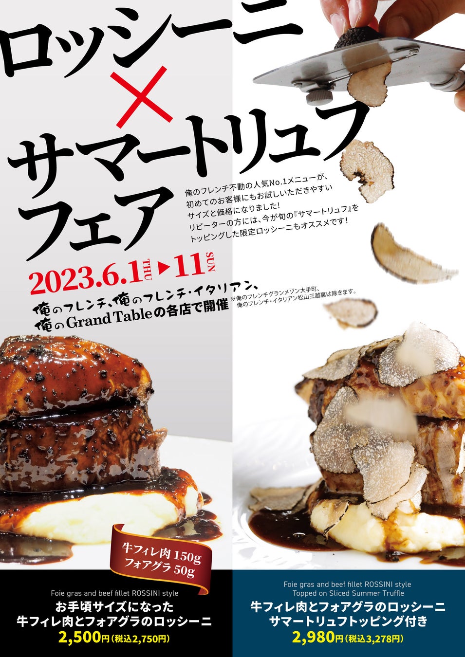 今回は、お手頃サイズになってさらにお求め安くなった『牛フィレ肉とフォアグラのロッシーニ』にサマートリュフをトッピングしたメニューをご用意いたします。6月11日までの期間限定の価格です。