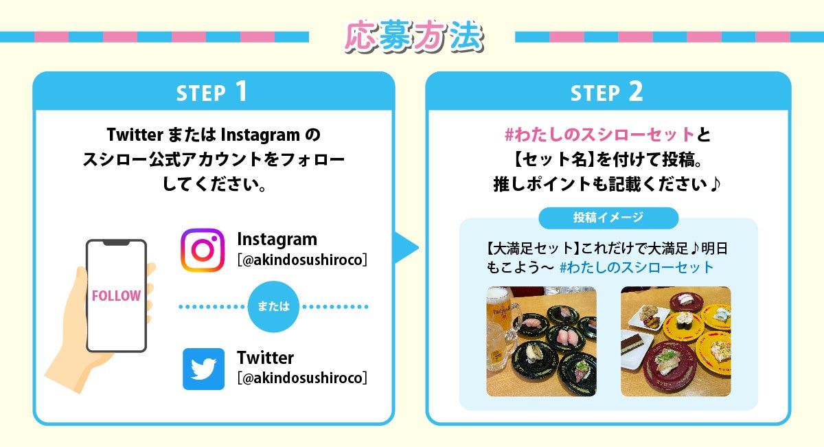 ■概要:キャンペーン期間中、スシロー公式TwitterまたはInstagramをフォローの上、ご自身のTwitter・Instagramにハッシュタグ「#わたしのスシローセット」とセット名をつけて投稿していただくと、抽選で50名様に2,000円分のお食事券をプレゼントいたします。投稿いただいた内容は特設サイト上に掲載されます。