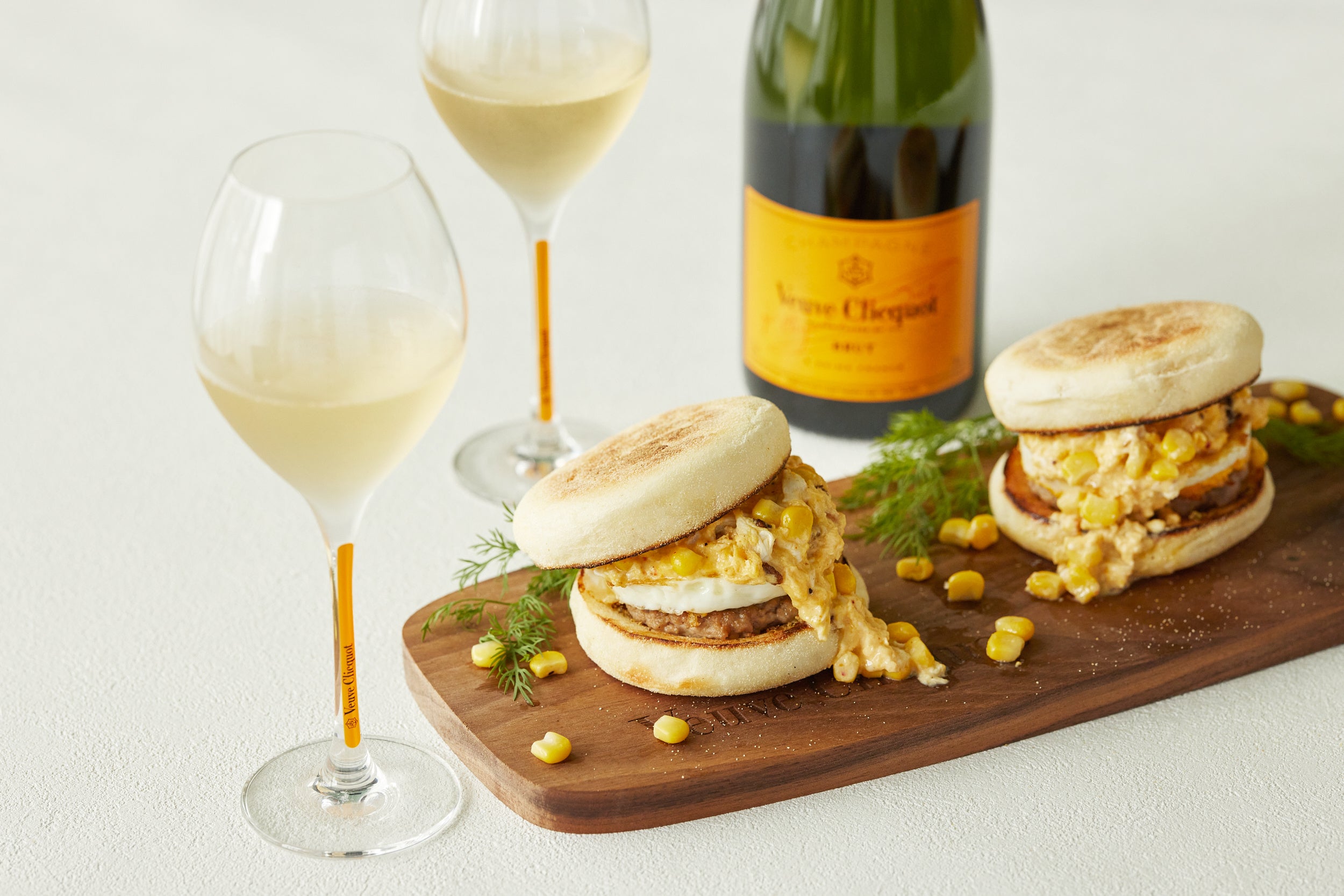 イングリッシュマフィンのコーンミールの食感とヴーヴ・クリコの小気味い繊細な泡が食欲を刺激します。豚肉にあわせた濃厚な醤油と白胡椒の華やかさ、とうもろこしの甘さに合わせたスパイシーな七味と相対する組み合わせを一つのバーガーに閉じ込め、幅の広い味わいはふくよかさももち合わながら、すっきりした味わいのヴーヴ・クリコと好相性です。