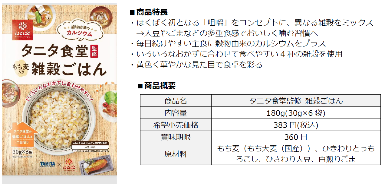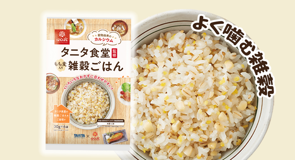「タニタ食堂監修雑穀ごはん」は、主食として食べる機会の多いごはんをより健康的に食べてもらいたいと考え、はくばくでは初となる「咀嚼」をコンセプトに開発しました。タニタ食堂の特徴の一つである『噛む』という要素に着目し、異なる食感や噛み応えを感じられるよう、もち麦、ひきわりとうもろこし、ひきわり大豆、白煎りごまをミックスしました。自然に咀嚼が増え、噛む回数を多くしてくれます。よく噛むことにより食べ物の消化を助けたり、満腹中枢を刺激して食べ過ぎを防いだりするなど、さまざまなメリットが期待されます。一方で、年齢を重ねるごとに嚙むことを苦手に感じる人も多いことが分かっています。