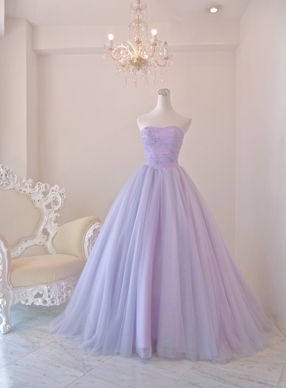 ラベンダーやピンクなどの色を合わせたグラデーションカラーが、とっても優しく愛らしい、ふんわりチュールのプリンセスドレス。何色もの色を重ねているので、動くたびに いろんな色が顔を覗かせ、グリッターチュールが内側からキラキラと品良く輝きます。ビスチェには、ラベンダーのグラデーションカラーのスワロフスキーを散らばるように刺繍しているので、動くたびにキラキラと輝きます。クールで上品な印象のドレスです。