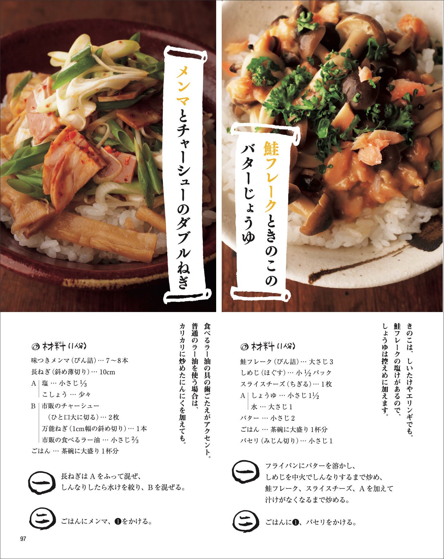 卵黄納豆マヨ、目玉焼きバターコーン、目玉焼きチャーシュー食べるラー油、半熟ゆで卵とねぎみそ…など、どのご家庭にもありそうな食材だけで「今日は何を作ろう…」と困った日にもだーっと作れるレシピから、少しだけ手間をかけて作る〝おかずいらず〟なボリューム丼までバラエティー豊かにメニューを掲載。すべて1人分から作れるレシピなので、1人暮らしを始めたばかりで料理が苦手な方にもオススメ!