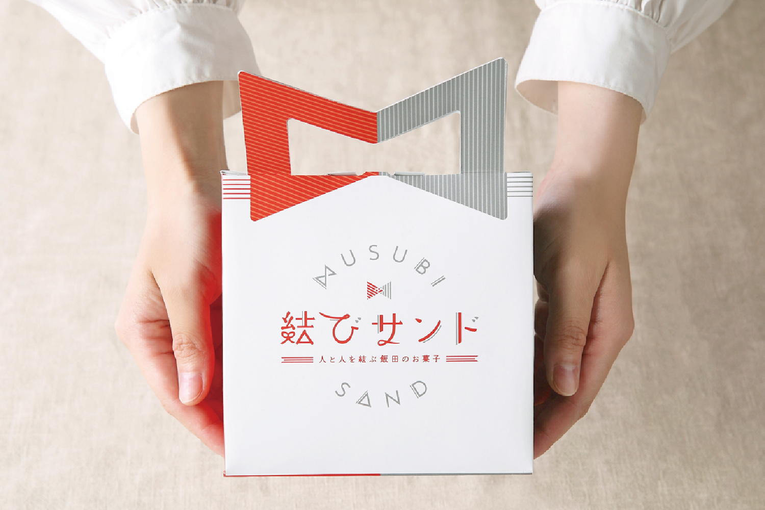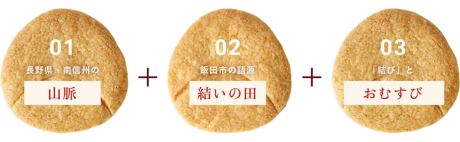 長野県飯田市は、南信州の山々にぐるりと囲まれた山脈の中にある町で、「飯田」の語源は「結いの田」から来ています。大部分が山間部な飯田市では、山を切り開きながら生活をしなければならず、協力して田植えをしてきた歴史があります。そんな背景から人と人との繋がりを大事にする「結び」と「田んぼ」をより形で表現し、結びサンドは三角形となっています。