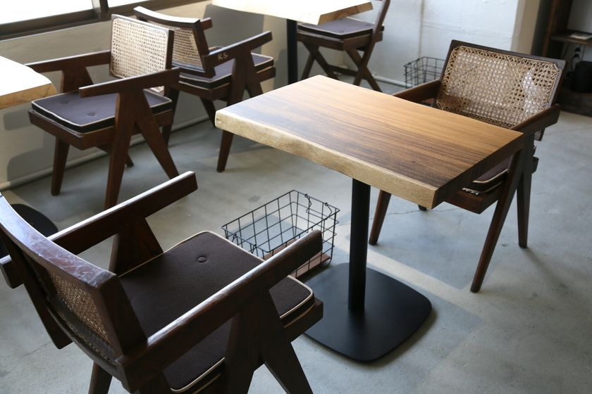 3種の樹の一枚板テーブル席とピエール・ジャンヌレの椅子