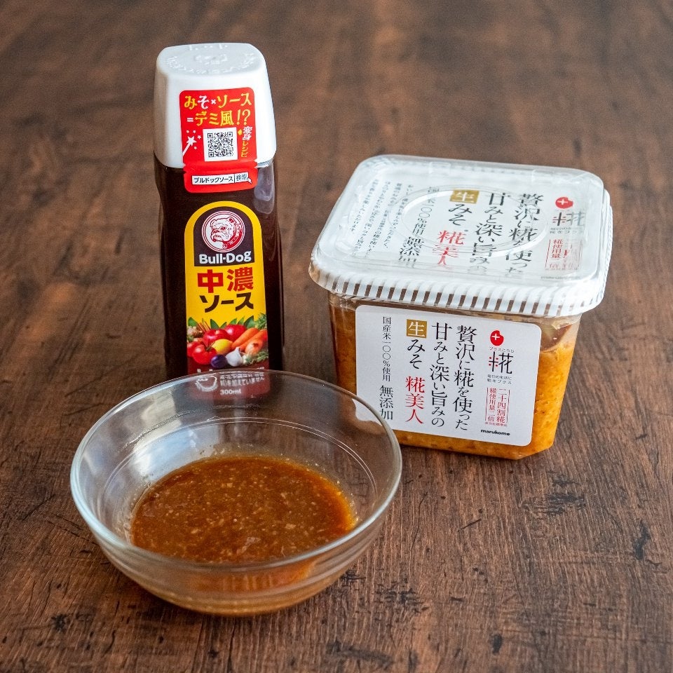 2021年より当社とマルコメ株式会社、ブルドックソース株式会社は、みそと中濃ソースを1:2の配合で混ぜて使う「万能味ソース」を家庭で体験してもらう取り組みを行っています。コロナ禍での料理のマンネリ化の悩みを解消する万能調味料として、どこの家庭の冷蔵庫にもある、みそと中濃ソースで作る「万能味ソース」の食卓での体験作りと、実際に使っている方からまわりへのおすすめの輪を拡げる料理投稿企画の場を提供してきました。