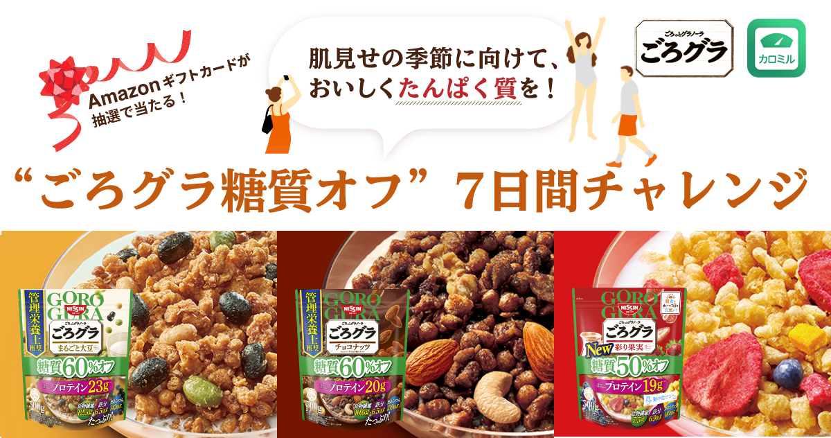 内容:期間中に下記対象商品の「ごろグラ」を購入・事前アンケートに回答し、カロミルで合計7日間以上食べた記録をした方の中から抽選で150名様に、2,000円分のAmazonギフトカードをプレゼントします。