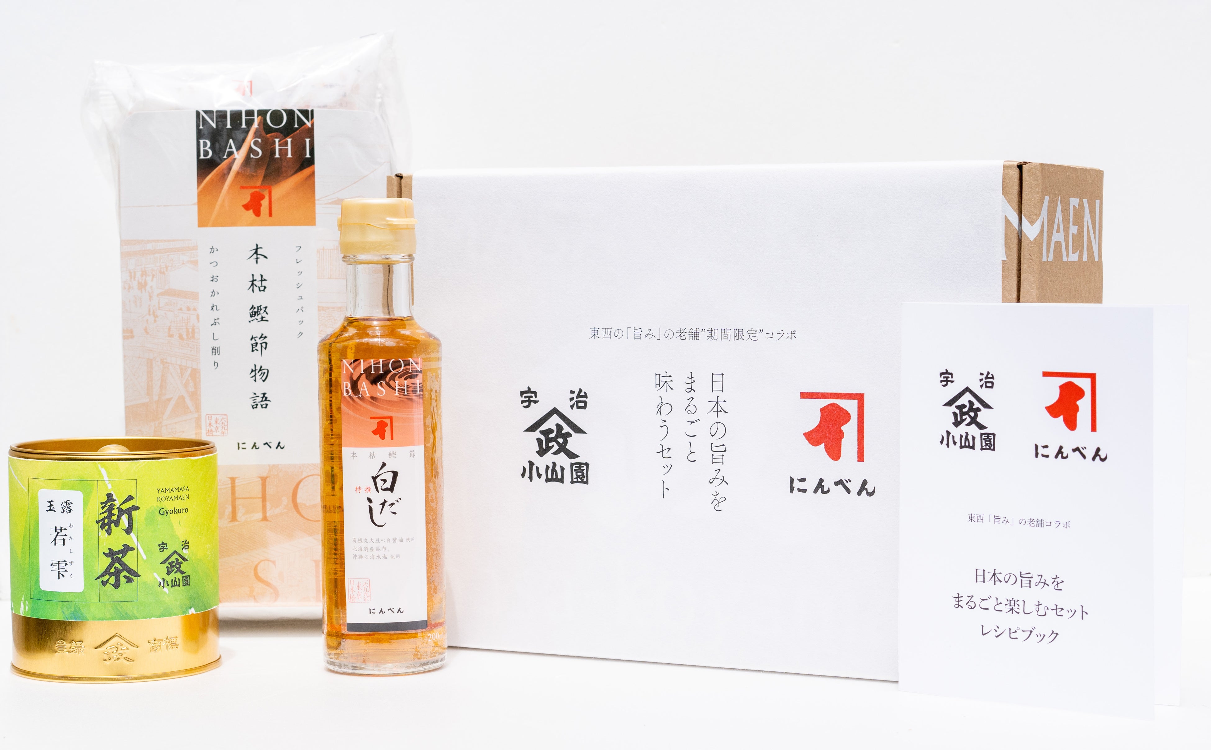 新茶玉露、上質な本枯鰹節を味わうことはもちろん、日頃捨ててしまいがちな「茶がら」「だしがら」に手を加えることで新たな価値を生み出し、最後まで美味しくいただく。そのステップをご家庭で楽しんでいただきたいという山政小山園の想いから今回のコラボレーションは生まれました。一年中手に入る食材が多い中、年に一度のお茶の「旬」を味わう格別なひと時を、製茶や鰹節づくりの歴史や魅力に触れながら、商品をご堪能ください。