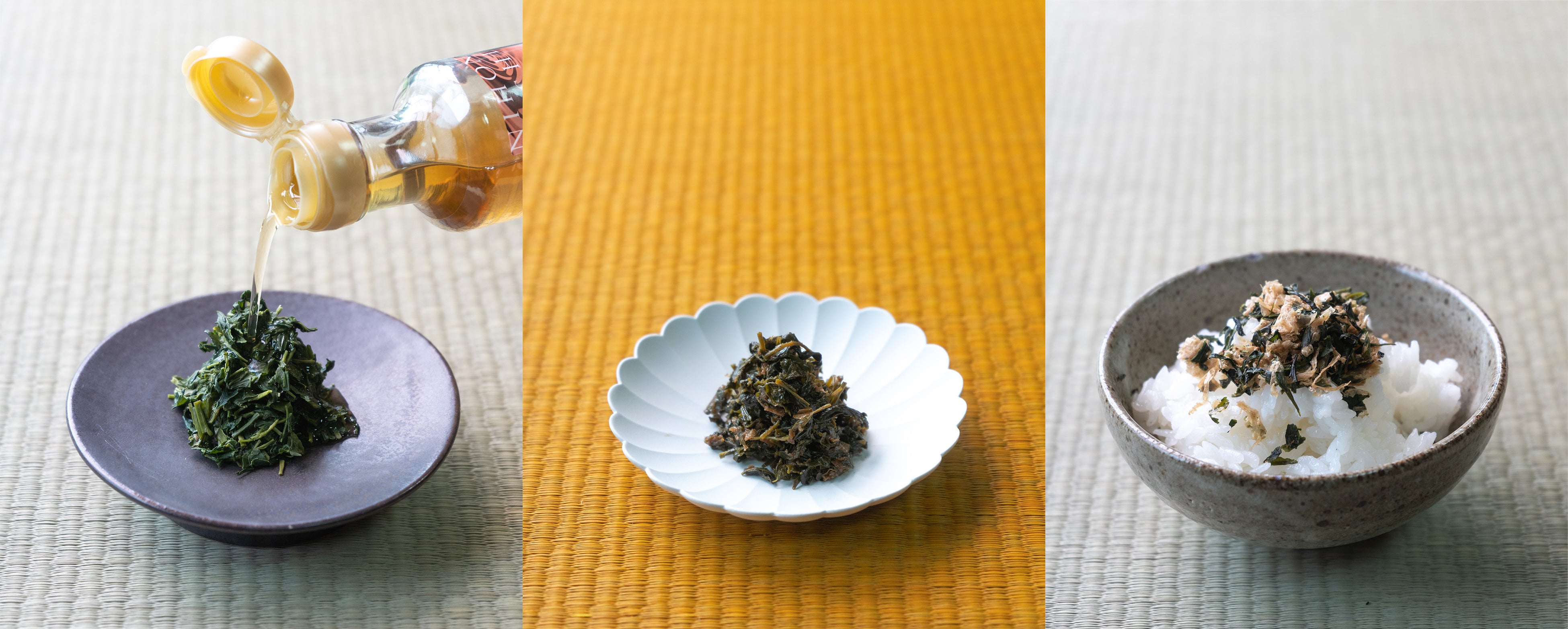 茶がらをそのまま白だしをかけて召し上がっていただく、「玉露のおひたし」は、柔らかな茶葉の爽やかな香りと旨みをそのまま味わっていただけます。「玉露と鰹節の佃煮」は、茶がらとだしがらに、白だしと醤油やみりんを加えて煮詰めるだけ。玉露の瑞々しさとかつおの旨みが楽しめます。茶がらとかつお節のだしがらに、白だし特撰を絡めて炒るだけの、「玉露と鰹のふりかけ」は、かつおの旨みと香ばしさの後に、お茶の香りが口に広がります。おうち時間をちょっと贅沢に、ひと手間を楽しむご提案となっています。(写真左から、おひたし・佃煮・ふりかけ)