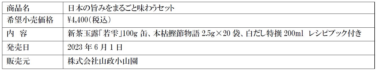 上質な本枯鰹節、新茶玉露を味わうことはもちろん、日頃捨ててしまいがちな「だしがら」「茶がら」に手を加えることで新たな価値を生み出し、最後まで美味しくいただく。そのステップをご家庭で楽しんでいただきたいという山政小山園様の想いから今回のコラボレーションは生まれました。一年中手に入る食材が多い中、年に一度のお茶の「旬」を味わう格別なひと時を、製茶や鰹節づくりの歴史や魅力に触れながら、商品をご堪能ください。