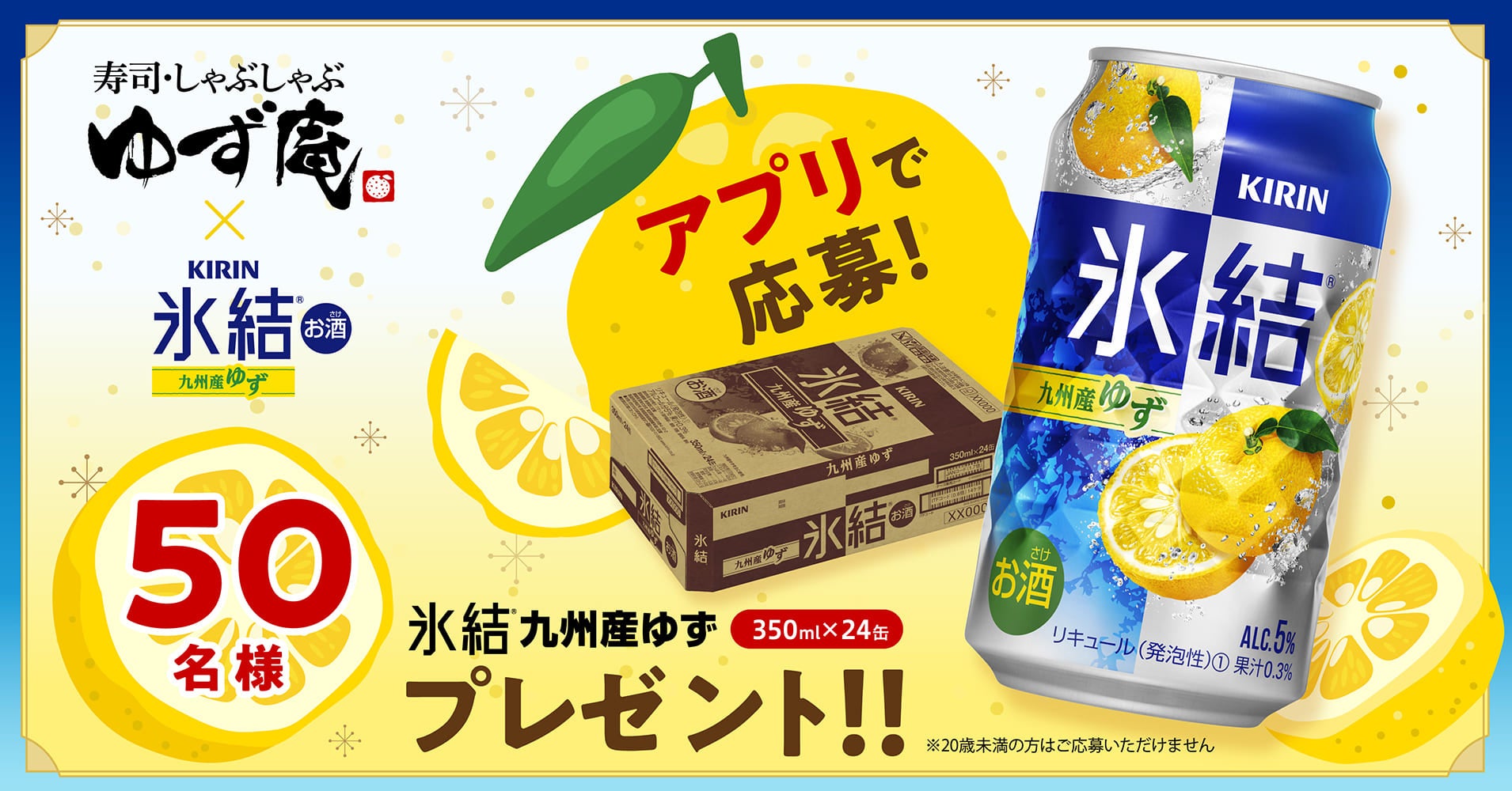 『ゆず庵』公式アプリの会員様、また新規登録いただいた方の中から、抽選で50名様に「キリン氷結®︎九州産ゆず」1ケース(350ml缶 24本入り)をプレゼントいたします。