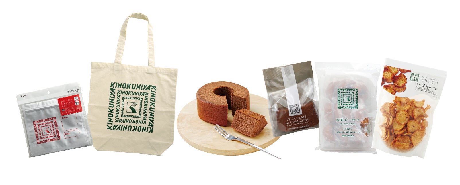 アルミチャック袋3枚入(1袋)、コットンバッグ グリーン(1枚)、チョコレートバウムクーヘン(1個)、