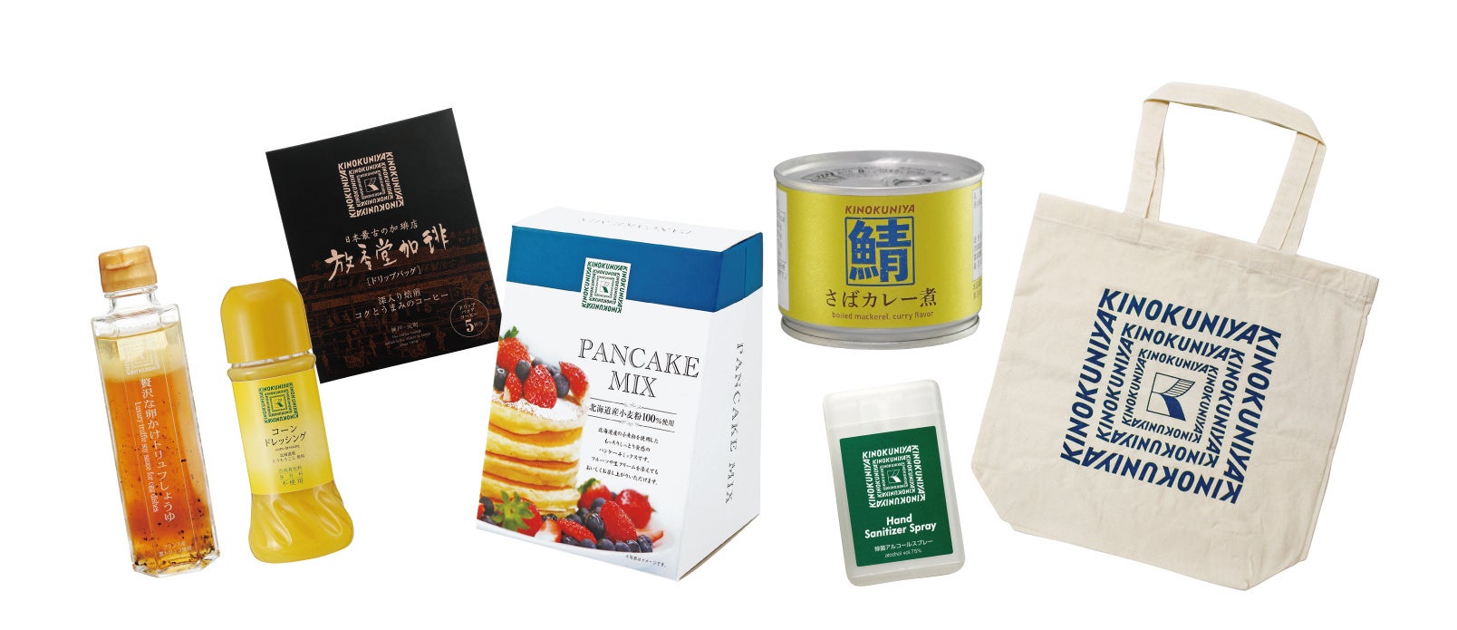 放香堂加琲ドリップバッグ(50g)、パンケーキミックス(450g)、さばカレー煮(190g)、カード式アルコールスプレー(1個)、コットンバッグブルー(1枚)