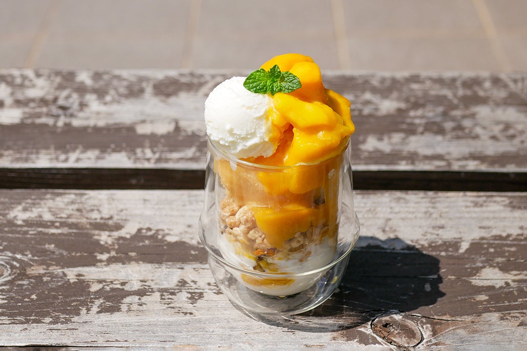 濃厚なマンゴー果肉と爽やかなヨーグルトを組み合わせた贅沢パフェ