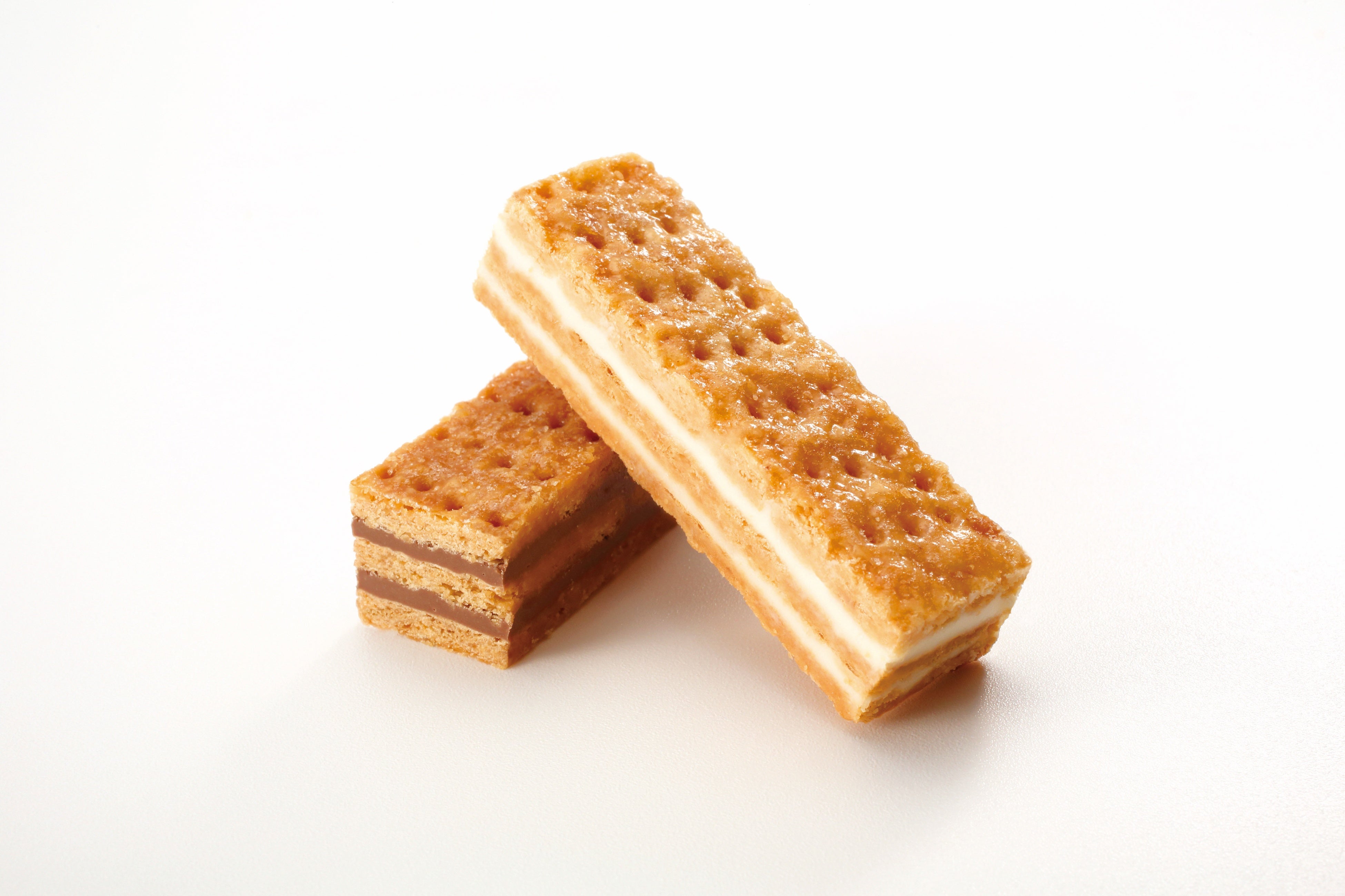 味は「ホワイト」と「ミルク」の2種あり、ホワイトはホワイトチョコレートのやさしい甘さとキャラメリゼのほろ苦さがマッチします。一方、ミルクは口いっぱいにミルク感が広がるまろやかな味わいに仕上げたどちらも絶妙な味わいのミルフィーユです。