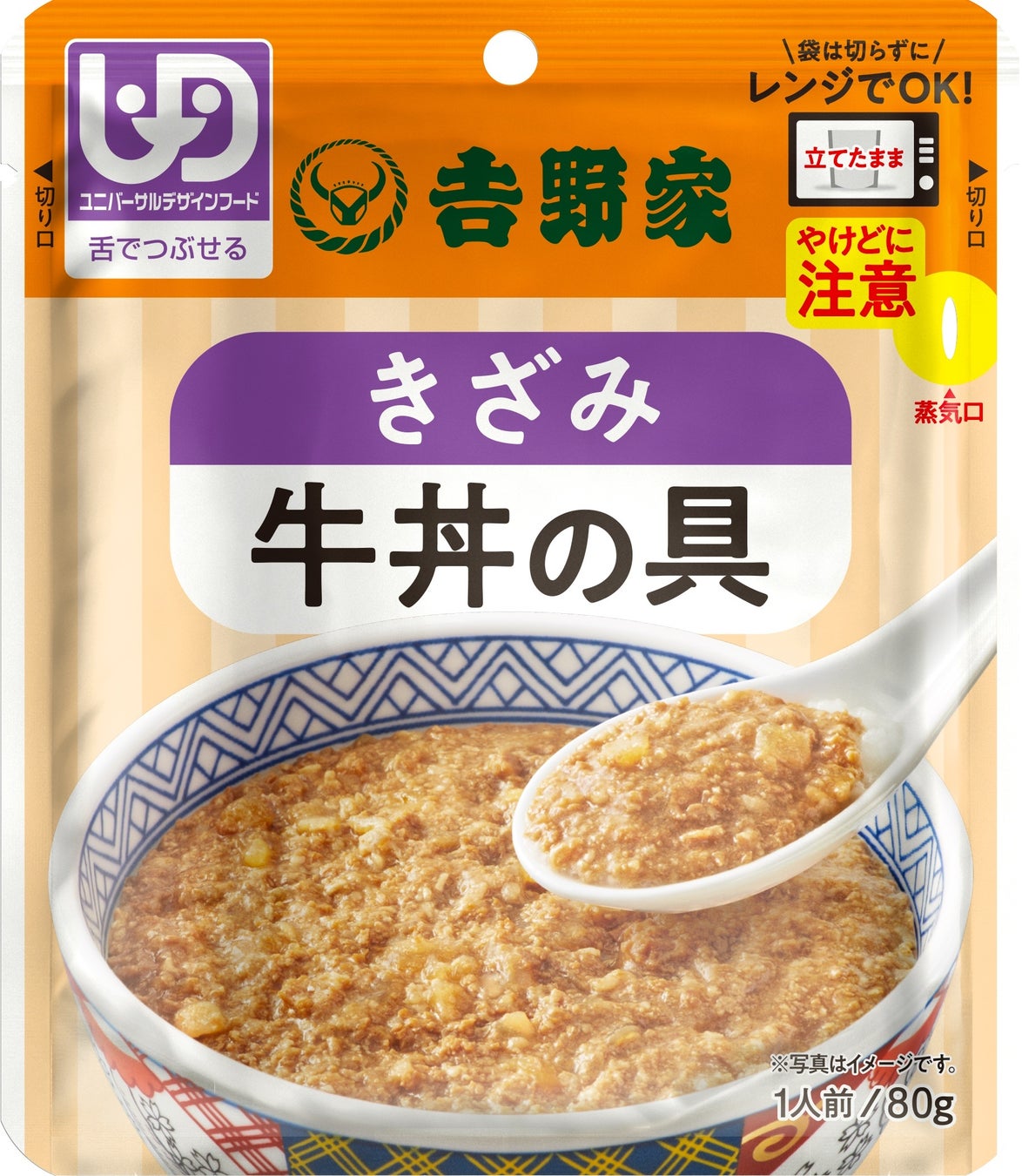 吉野家は主力商品である「牛丼」は誰もがお楽しみいただけるよう、時代や社会構造の変化と共に変わりゆくお客様の暮らしに応じて提供方法を拡大し続けています。現在、全国にある1,202店舗(2023年4月末時点)で出来立ての「牛丼」を店内飲食、テイクアウト、ドライブスルー、各種デリバリーサービスで提供しています。また、1993年に生活協同組合コープこうべと共同で「冷凍牛丼の具」を販売開始以降、30年以上にわたって生協や通販サイト、宅配事業サービス、総合スーパーなど販路を拡大しながら、広く皆様にご愛顧いただいています。「やわらか牛丼」はご高齢の方に限らず、様々な理由で摂食嚥下機能が低下した方や塩分制限をされている方が、楽しく、美味しくお召し上がりいただける牛丼の具をご提供したいという思いから開発しました。牛肉は筋の少ない部位を使用し、適度にトロミを加え、食べやすくなっています。