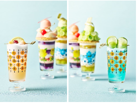 新しくて懐かしい、昭和レトロなアデリアレトロのグラスで提供するパフェは夏限定のスペシャルなスイーツタイムをお届けします。パフェとペアリングのモクテルもどうぞ。
