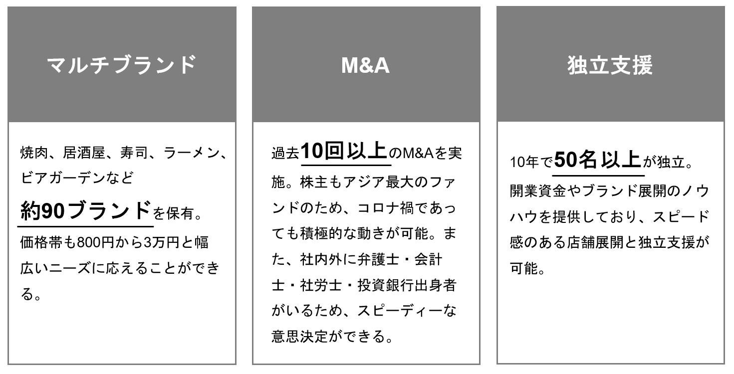 過去10件以上のM&A経験とアジア最大級のファンドPAGの資金力を有するGYRO HOLDINGSでは、今後も積極的にM&Aを検討していく考えです。そのため、「食で未来を創る」という当社の理念や考えに共感し、共に未来を切り拓ける可能性のある企業を常に募っております。引き続き、そば・うどん・とんかつ・焼肉・ハンバーグ・郊外型レストラン等、幅広いジャンルをグループに迎え入れ、日本の素晴らしい食を世界に届けられる飲食企業をグループ一丸となり目指してまいります。