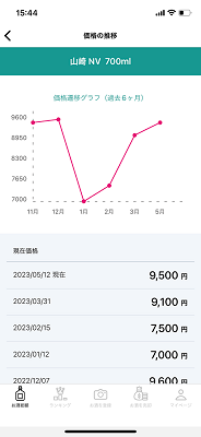 ※画像参考『MyCellar(マイセラー)』アプリ内「山崎NV 700ml」の価格推移 相場の上昇を確認し、売却タイミングを検討できる。