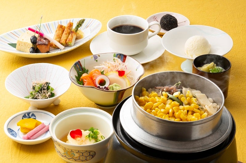 【お食事】炊きたて釜飯:「財田米 樽前湧水豚と洞爺湖町産雪蔵馬鈴薯(とうや)」または「財田米 洞爺湖町産スイートコーン」※どちらか選択、味噌汁、香の物