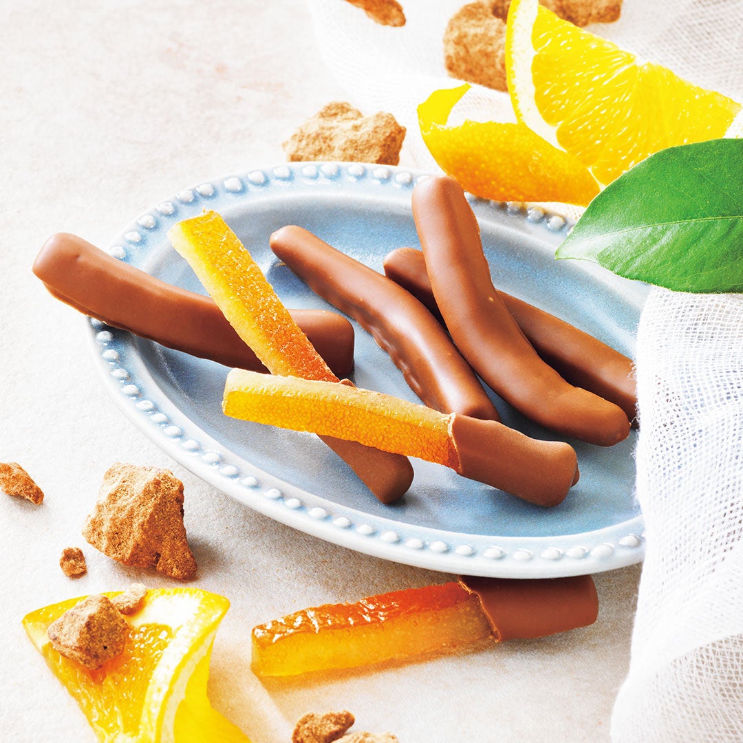 洋酒をまぶした糖漬けオレンジピールを、黒糖とキャラメル風味のチョコレートでコーティング。黒糖を使ったチョコレートとキャラメル風味のチョコレートをブレンドしたことで、より複雑で奥深い味わいに仕上げました。黒糖とキャラメルのまろやかな甘さ、オレンジピールのしっとりとした食感とさわやかな味わいが絶妙に調和します。