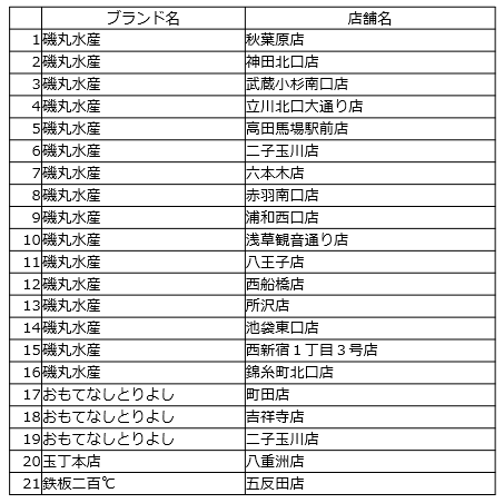 当社は、鮮魚・活貝を名物とする「磯丸水産」、鶏料理をメインとした「おもてなしとりよし」、「鳥良商店」、大衆酒場「五の五」などの業態を中心に全15ブランド約200店舗を展開しています。